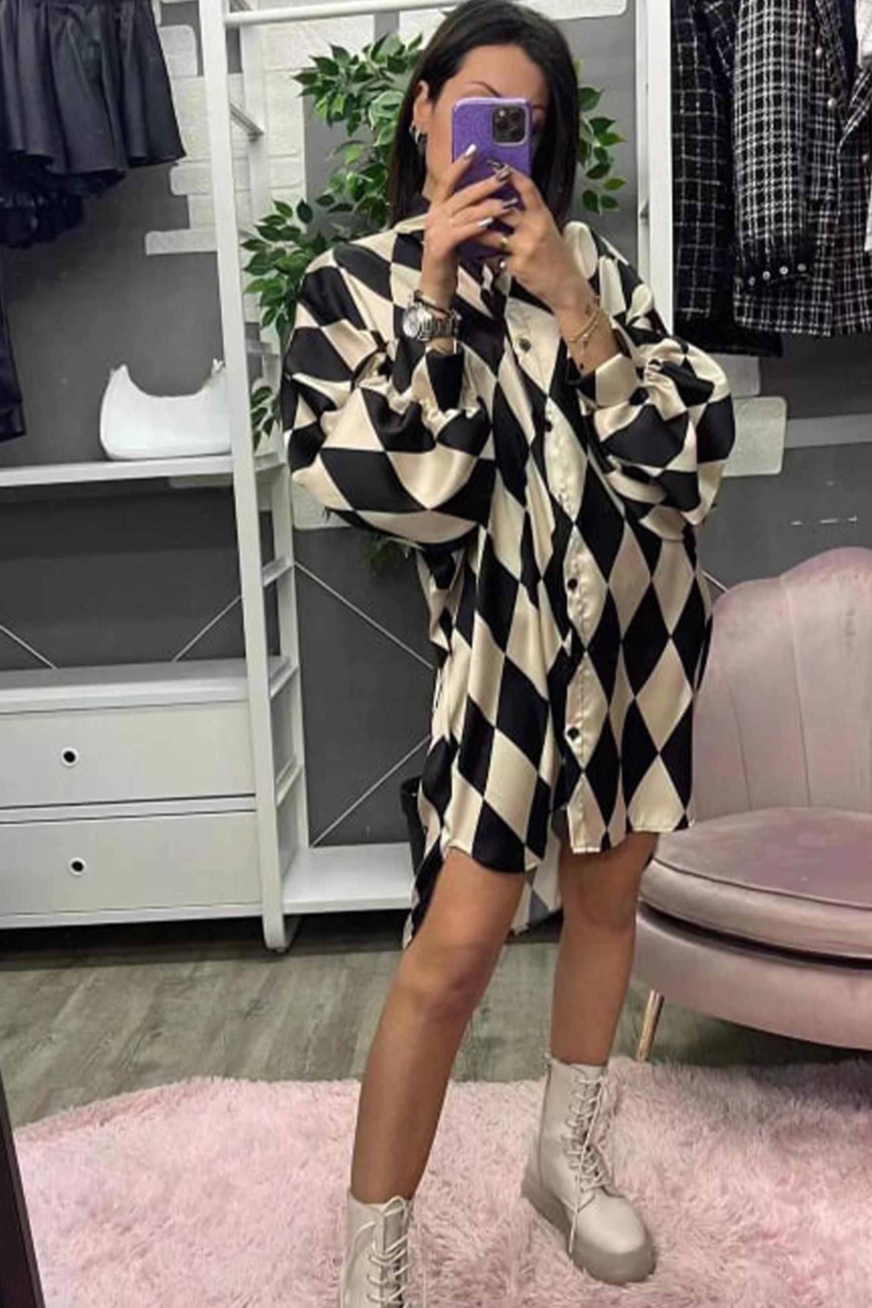 Ασπρόμαυρο πουκάμισο φόρεμα με γεωμετρικά σχέδια pierrot pattern style.