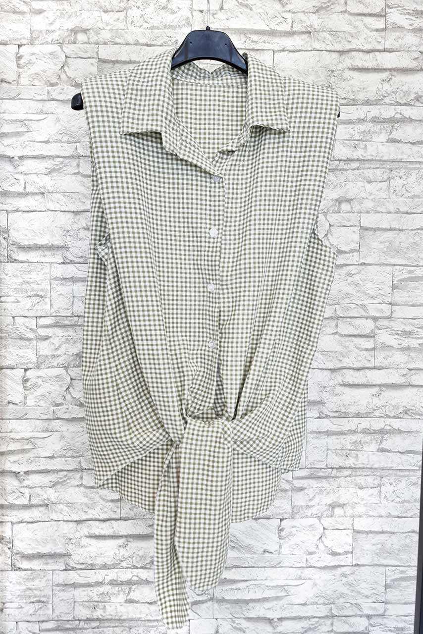 Girly casual αμάνικο καρώ button linen πουκάμισο σε χακί απόχρωση με λεπτομέρεια μικρές βάτες.