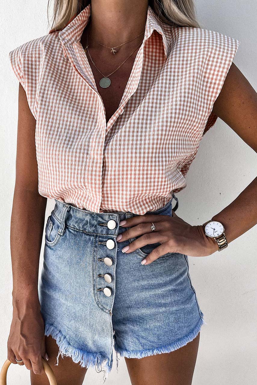 Girly casual αμάνικο καρώ button linen πουκάμισο σε ροζ απόχρωση με λεπτομέρεια μικρές βάτες.