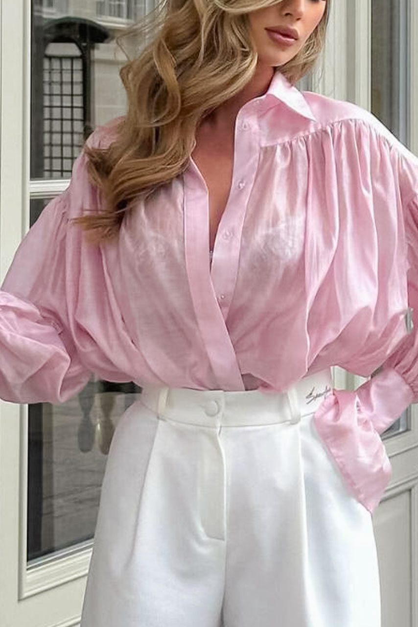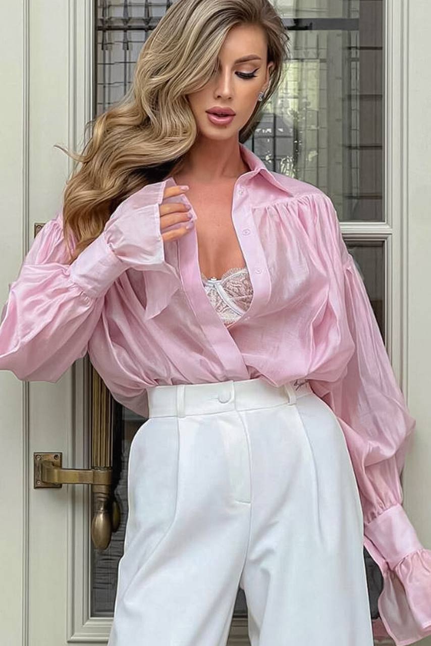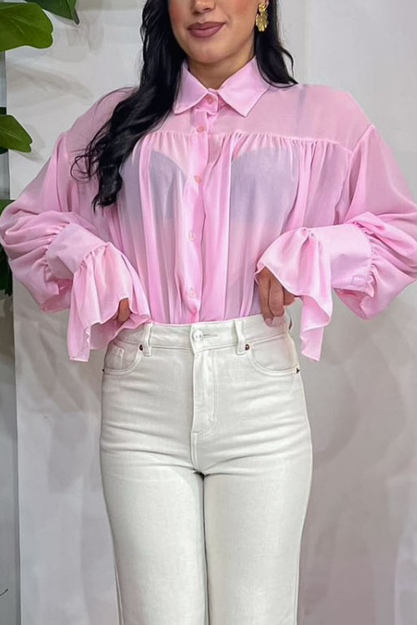 Πουκάμισο διάφανο που διαθέτει κλασικό γιακά, κουμπιά κατά μήκος και εντυπωσιακά μανίκια με βολάν, προσφέροντας μια ρομαντική και μοντέρνα εμφάνιση. Το ελαφρύ και διαφανές ύφασμα την καθιστά ιδανική για layering, ενώ μπορεί να φορεθεί τόσο σε casual όσο και σε πιο επίσημες περιστάσεις. Συνδυάστε τη με τζιν ή φούστα για ένα ολοκληρωμένο look. Είναι one size και καλύπτει έως Large.