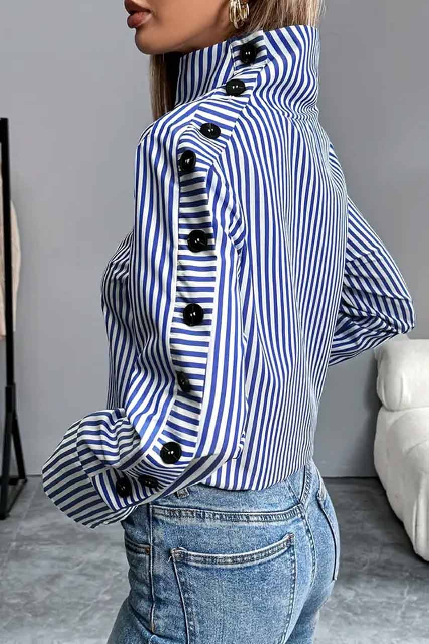 Κλασικό, διαχρονικό, αλλά με μια statement ανατροπή! Το ριγέ πουκάμισο με ψηλό structured γιακά και bold κουμπιά στη πλάτη και τα μανίκια είναι η απόλυτη προσθήκη σε μια chic & δυναμική γκαρνταρόμπα. Το μπλε-λευκό ριγέ μοτίβο αποπνέει effortless elegance, ενώ οι oversized μανσέτες και το loose fit του το κάνουν ιδανικό για άνετες, αλλά sophisticated εμφανίσεις.
