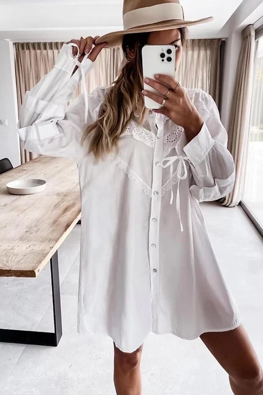 Romantic πουκάμισο φόρεμα με δαντέλα σε λευκή απόχρωση με vintage μικρά κουμπιά και βολάν στο πάνω μέρος.