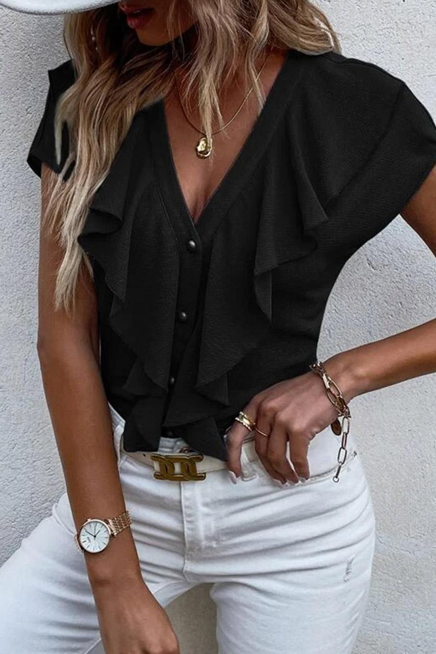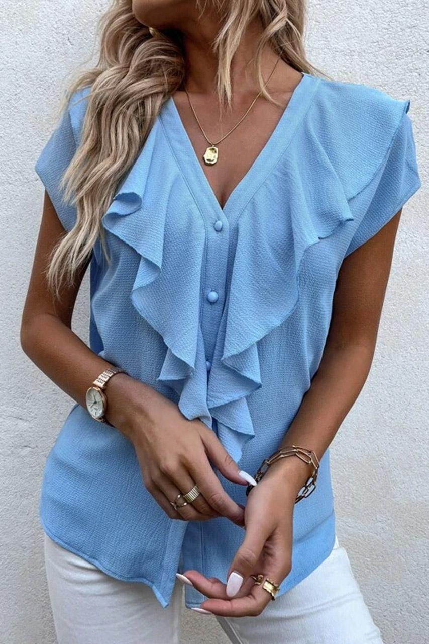 Romantic casual κοντομάνικο πουκάμισο V neck με βολάν περιμετρικά σε παλ καλοκαιρινές αποχρώσεις.