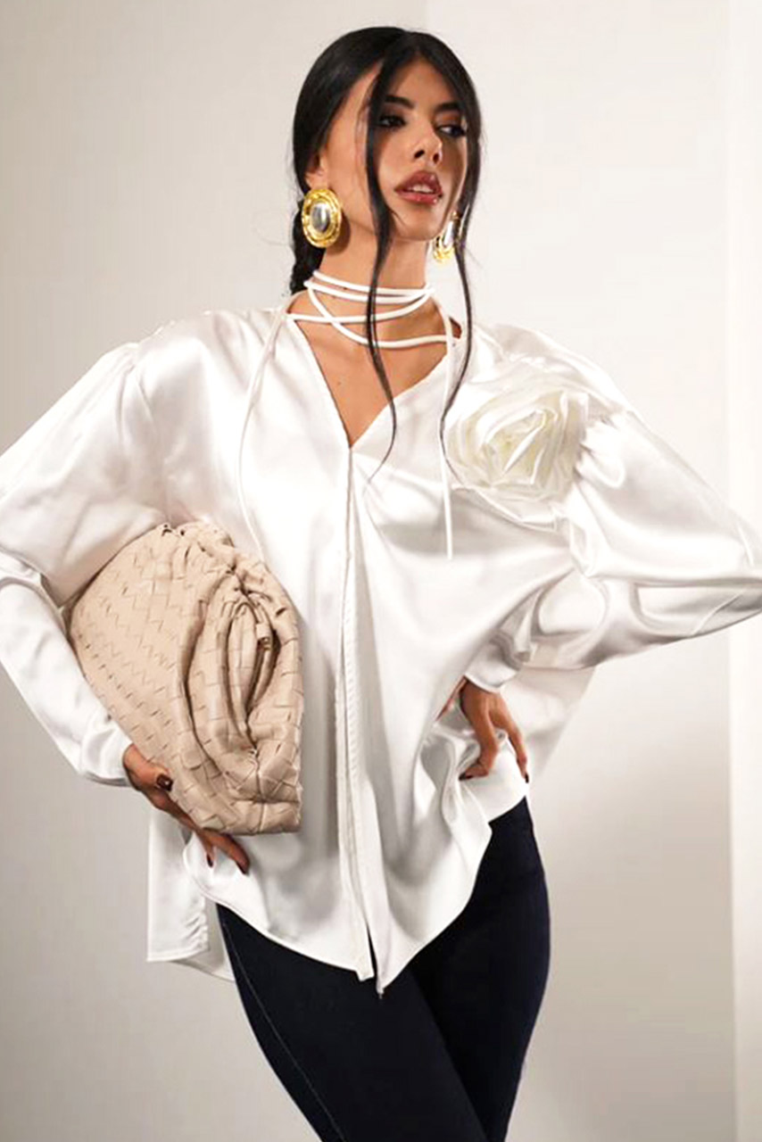 Σατέν λευκό ασύμμετρο V neck πουκάμισο με μπουτονιέρα