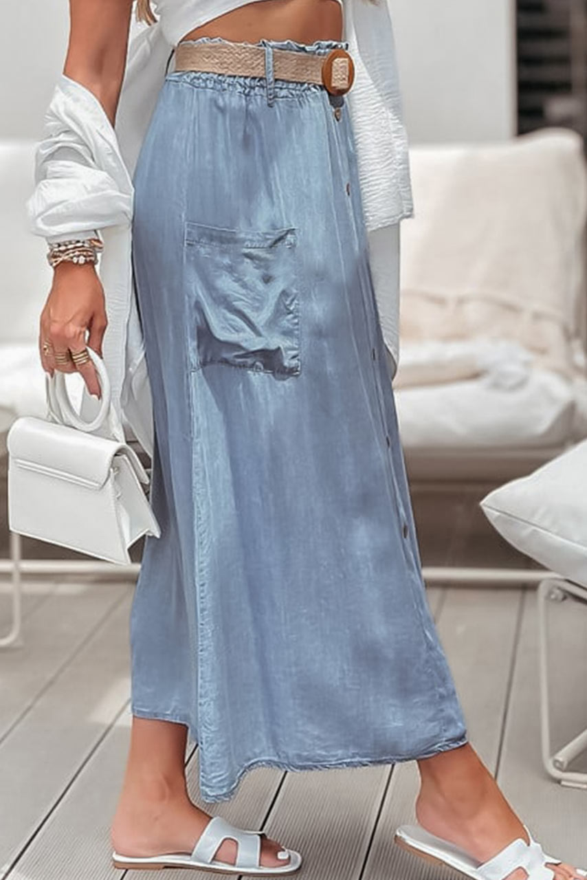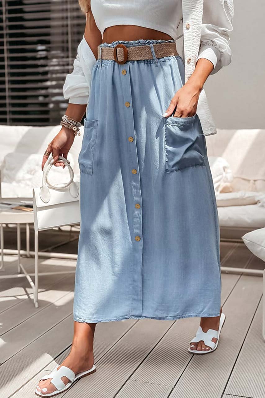 Η απόλυτη casual chic επιλογή για την άνοιξη και το καλοκαίρι! Αυτή η φούστα midi από ελαφρύ denim ύφασμα είναι η επιτομή της ανεπιτήδευτης κομψότητας. Το κουμπί που διατρέχει όλο το μήκος προσθέτει διακριτική ρετρό αισθητική, ενώ η ελαστική μέση προσφέρει άνεση και ευκολία στην εφαρμογή. Οι μεγάλες πλαϊνές τσέπες χαρίζουν πρακτικότητα και χαλαρό urban vibe. Iδανική για καθημερινές εμφανίσεις στην πόλη, για καλοκαιρινές βόλτες ή για το σαββατοκύριακο σε νησί. Φόρεσέ τη με crop top, flat σανδάλια και ψάθινη τσάντα για ένα σύγχρονο boho look που ξεχωρίζει.