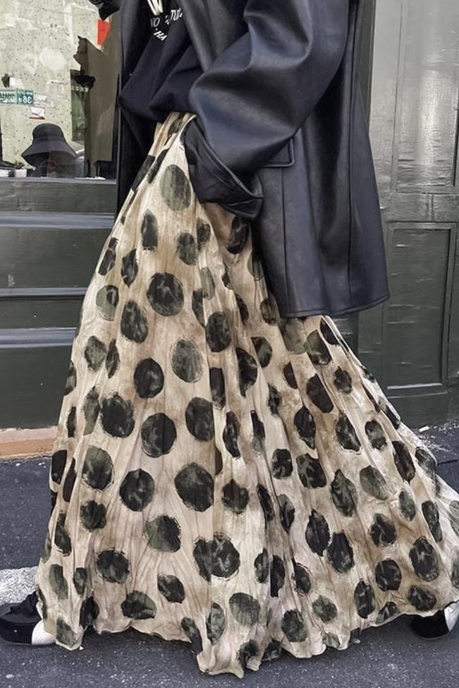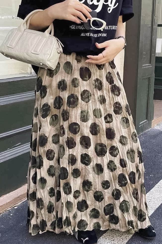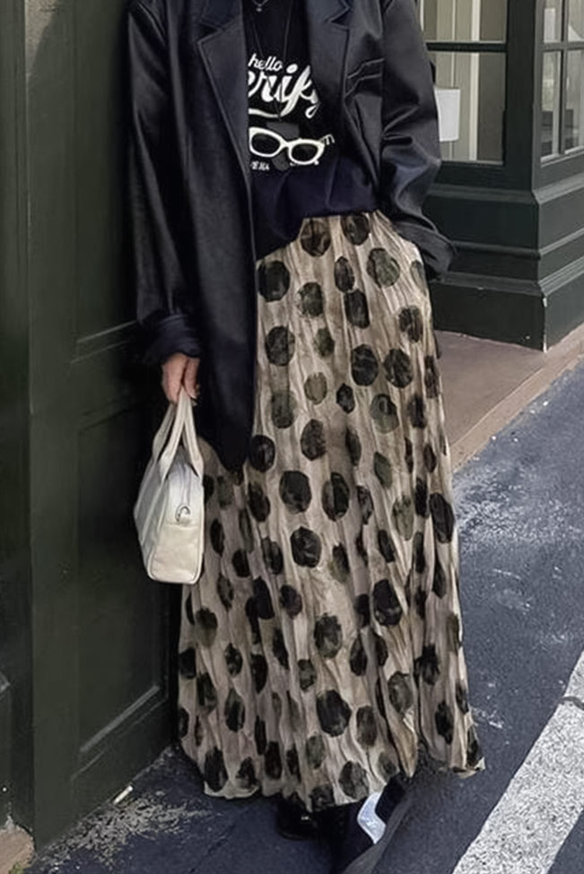 Ανανεώστε την γκαρνταρόμπα σας με αυτή τη statement μακριά φούστα, διακοσμημένη με εντυπωσιακό μοτίβο από μεγάλους κύκλους. Σε κομψή καφέ απόχρωση, προσφέρει αέρινη κίνηση και στιλ που δεν περνά απαρατήρητο. Το ελαστικό λάστιχο στη μέση εξασφαλίζει άνετη εφαρμογή, ενώ το ανάλαφρο ύφασμα την καθιστά ιδανική για κάθε περίσταση, από casual street style μέχρι chic εμφανίσεις.