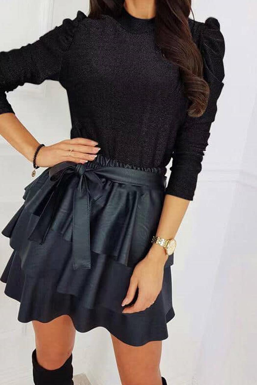 Glam girly μαύρη δερμάτινη φούστα με βολάν και overlay ζώνη φιόγκος.