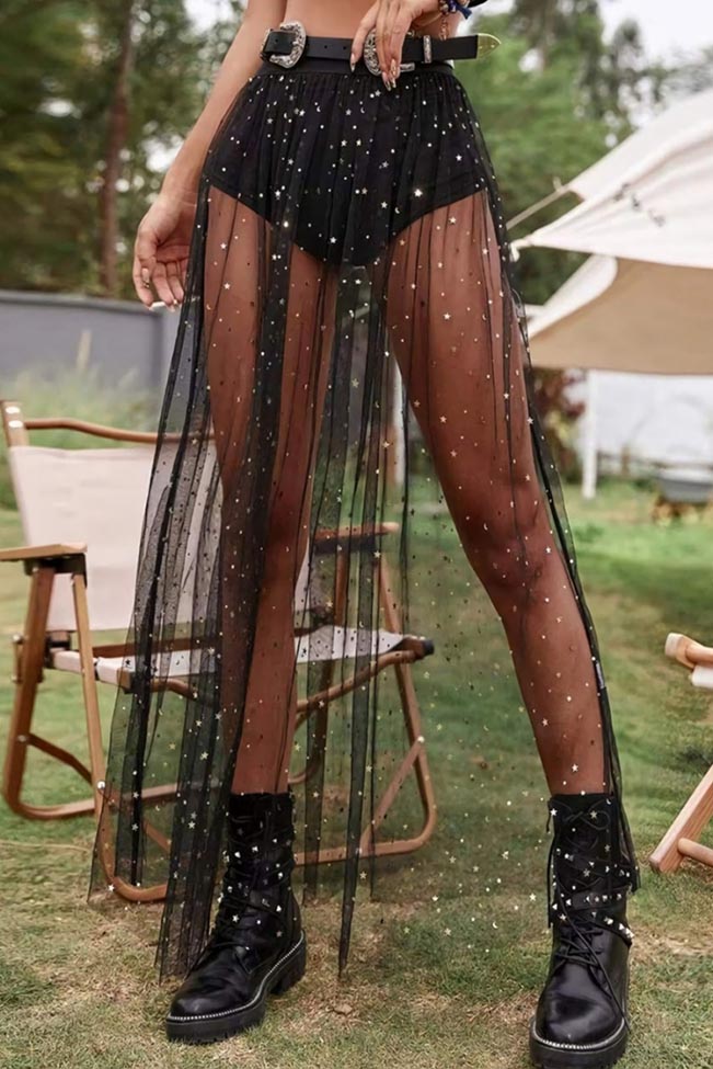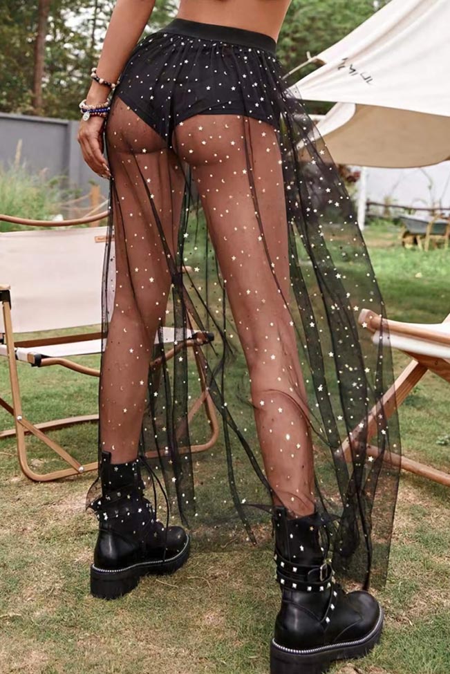 Διάφανη μαύρη φούστα με ελαστικό λάστιχο στην μέση και ενσωματομένο σλιπάκι. Διαθέτει υπέροχο print αστεράκια.