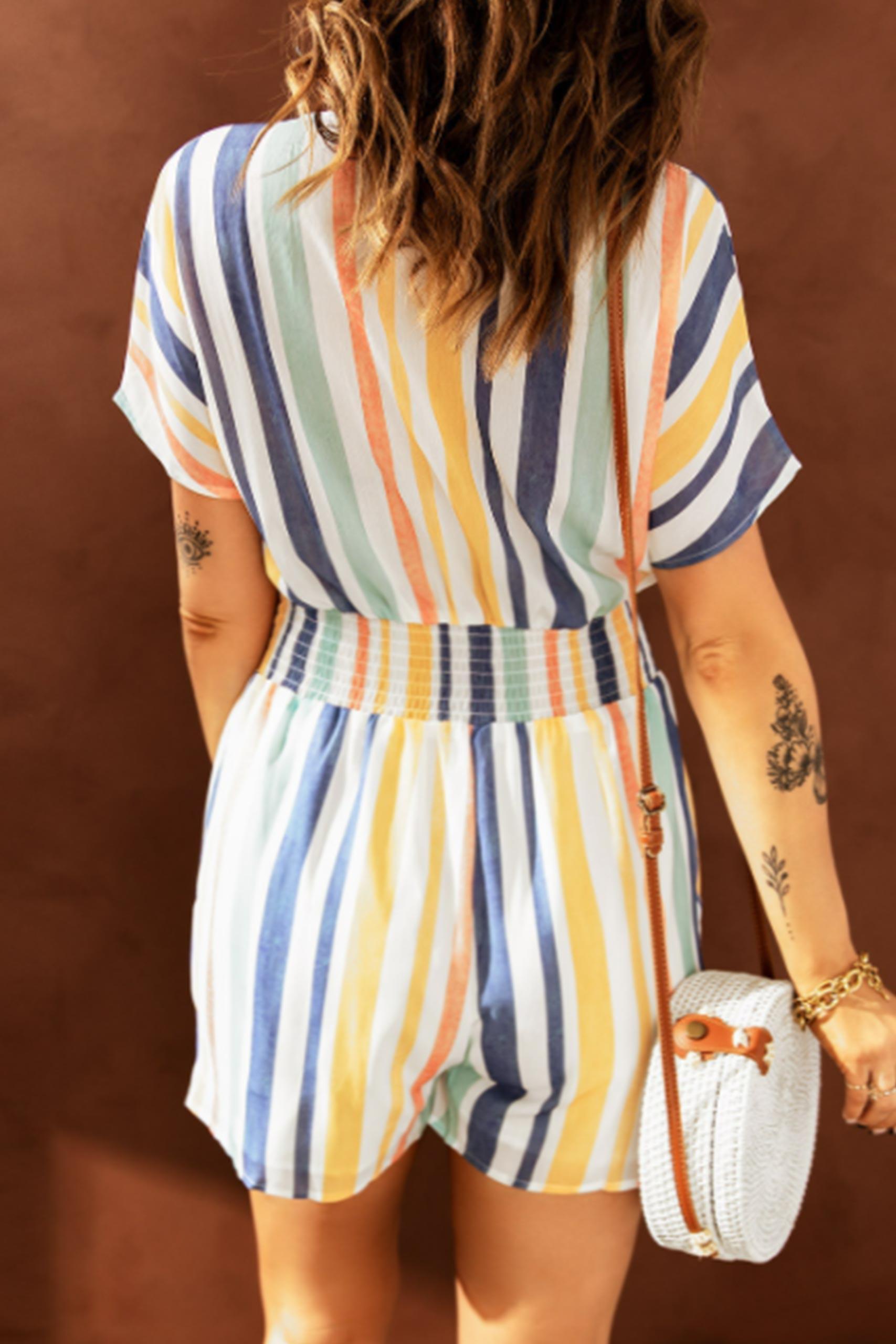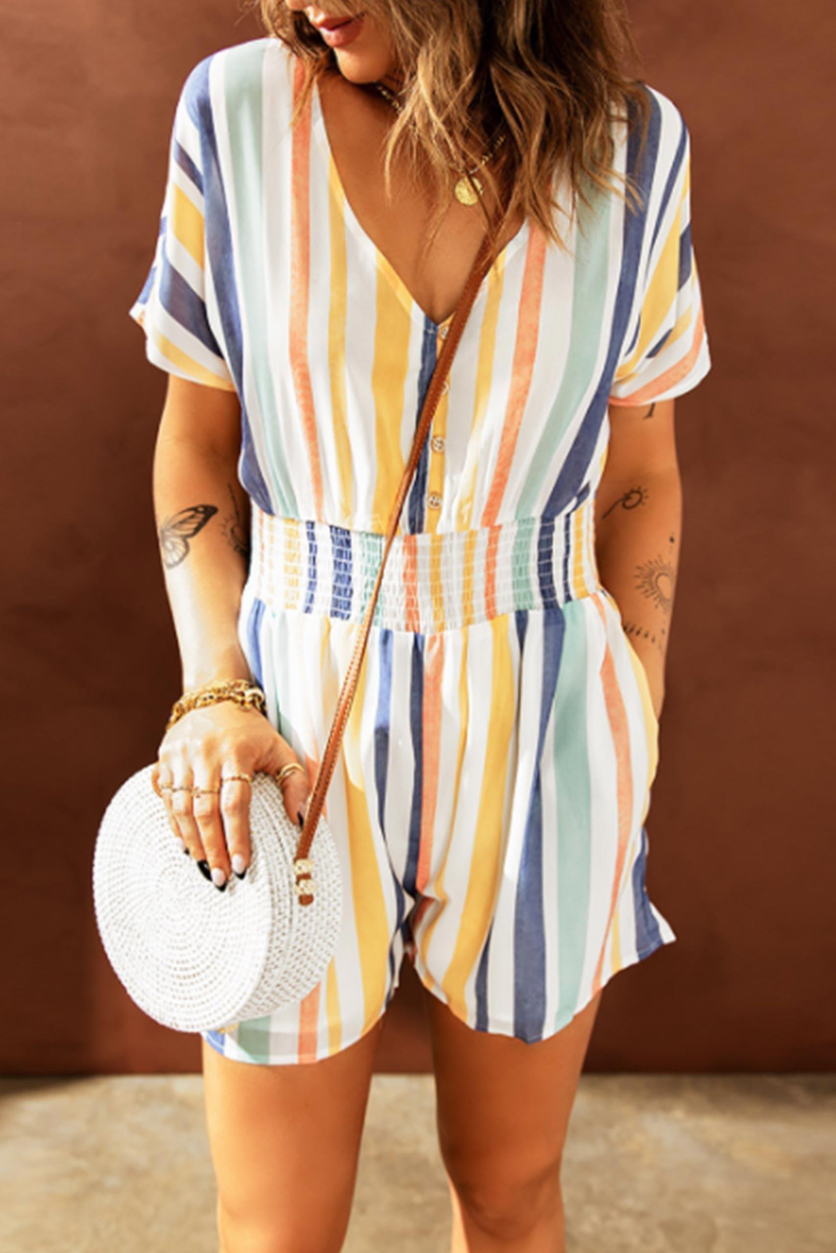 Ριγέ V neck playsuit ολόσωμη φόρμα σορτσάκι σε ανοιχτή απόχρωση με λάστιχο στη μέση και κουμπιά κατά μήκος.