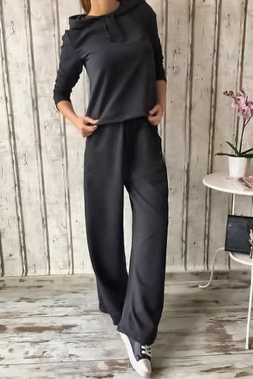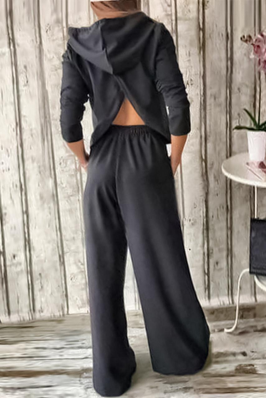 All day casual σετ σε μαύρη απόχρωση με μπλούζα μακρυμάνικη με χαμηλό άνοιγμα στην πλάτη, κουκούλα και παντελόνι καμπάνα.