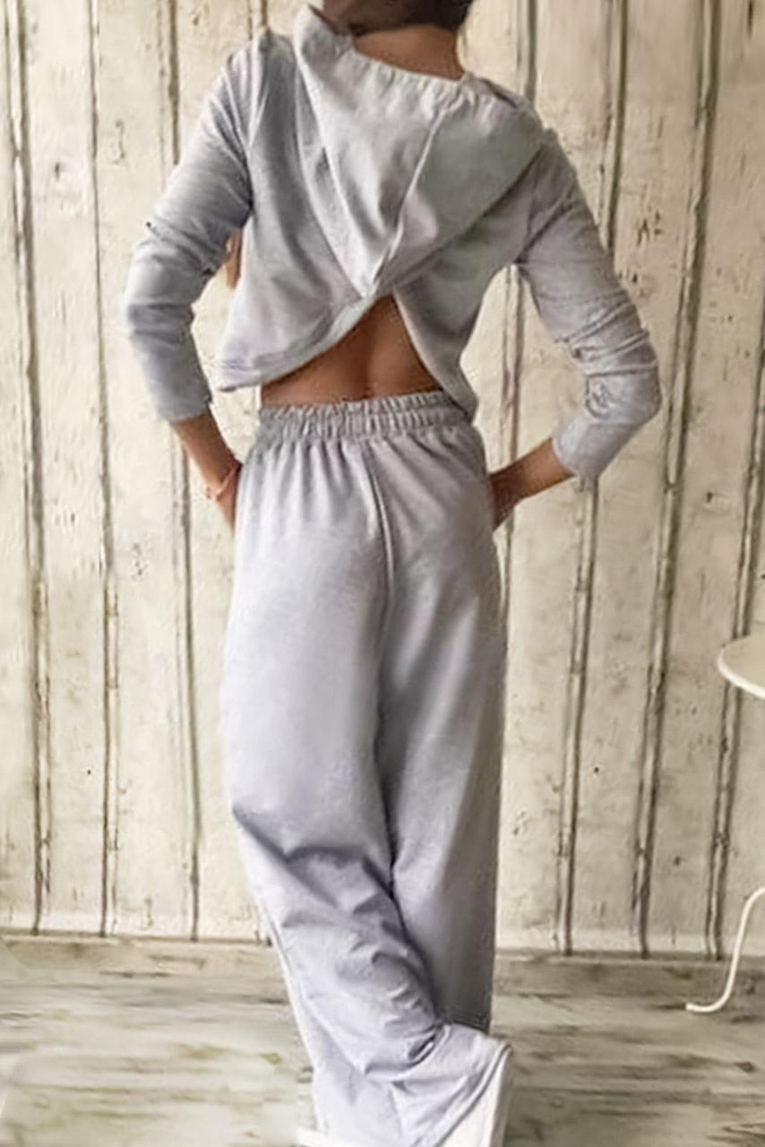 All day casual σετ σε γκρι απόχρωση με μπλούζα μακρυμάνικη με χαμηλό άνοιγμα στην πλάτη, κουκούλα και παντελόνι καμπάνα.