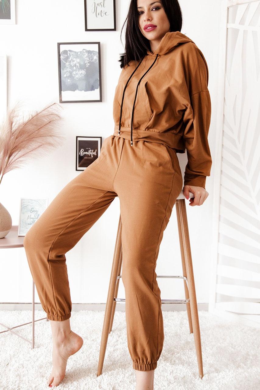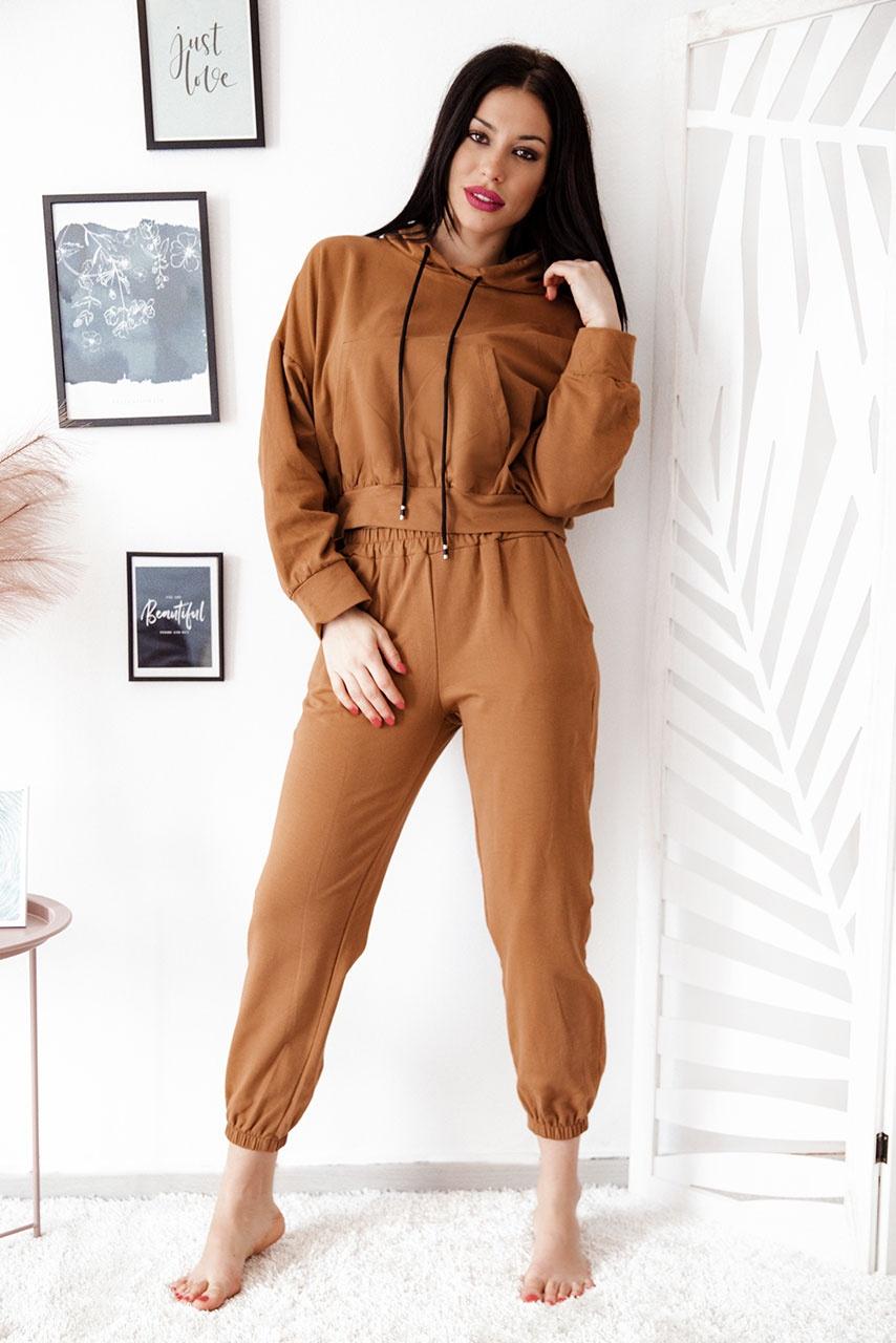 Μονόχρωμο σετ φόρμας σε καφέ κάμελ και γκρι χρώμα, με hoodie και μεγάλη τσέπη μπροστά.