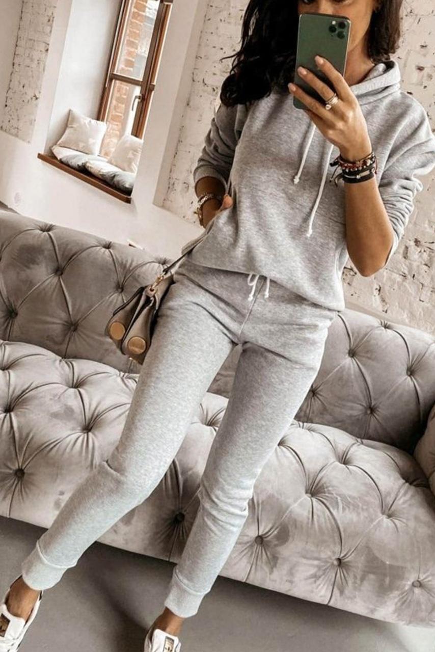 Μακρυμάνικο tracksuit σετάκι σε γκρί χρώμα, με φούτερ με κουκούλα και παντελόνι φόρμας με λάστιχο στη μέση και στο τελείωμα.
