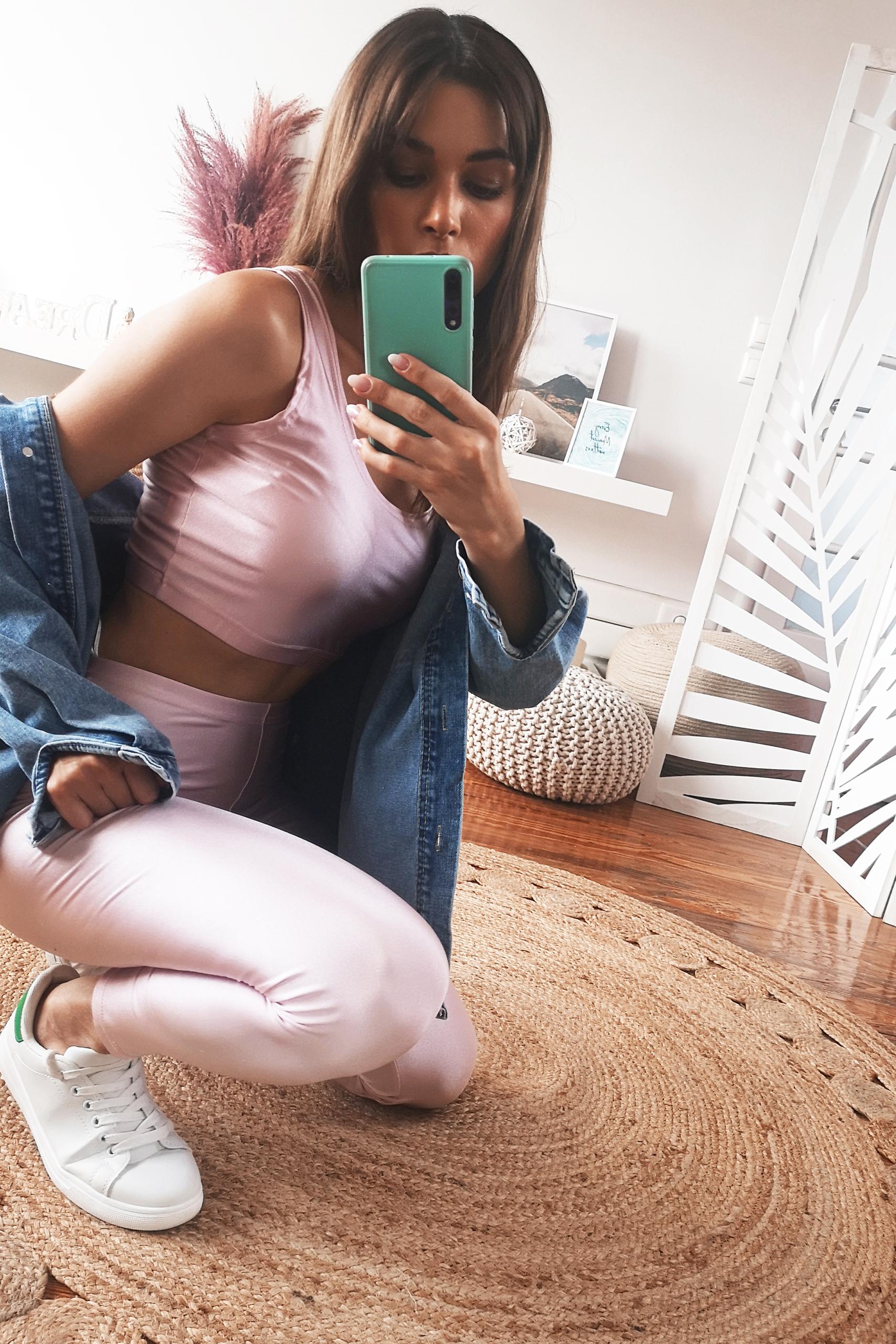 90s inspired metallic workout σετ με crop top και κολάν σε μεταλλική ροζ απόχρωση.