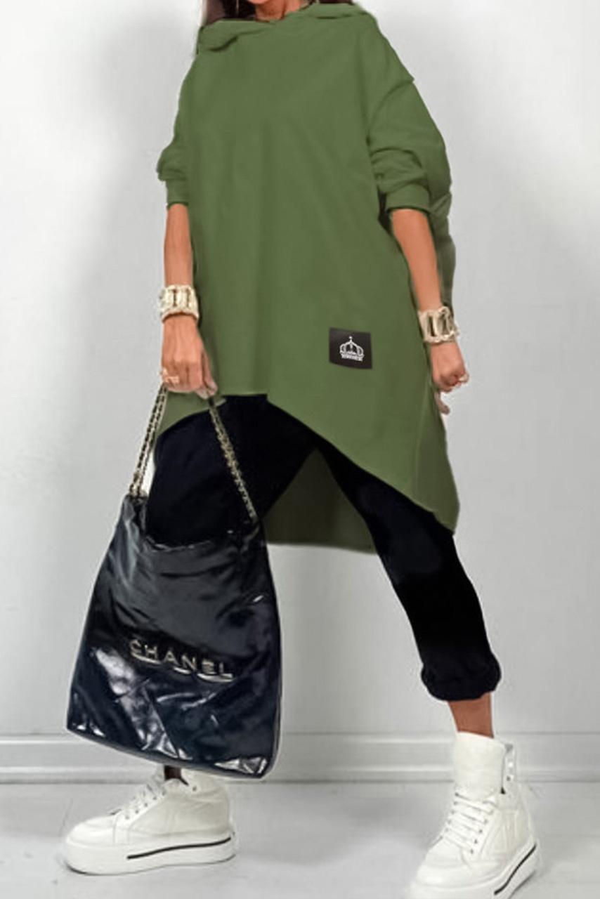 Casual ασύμμετρο χακί oversized φούτερ με κουκούλα και κορδόνια για άνετο και στιλάτο style.
