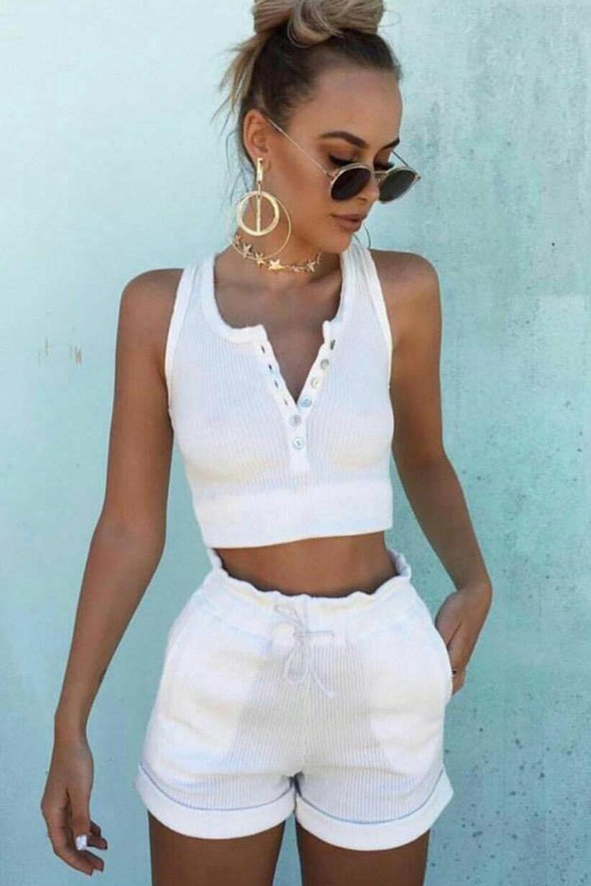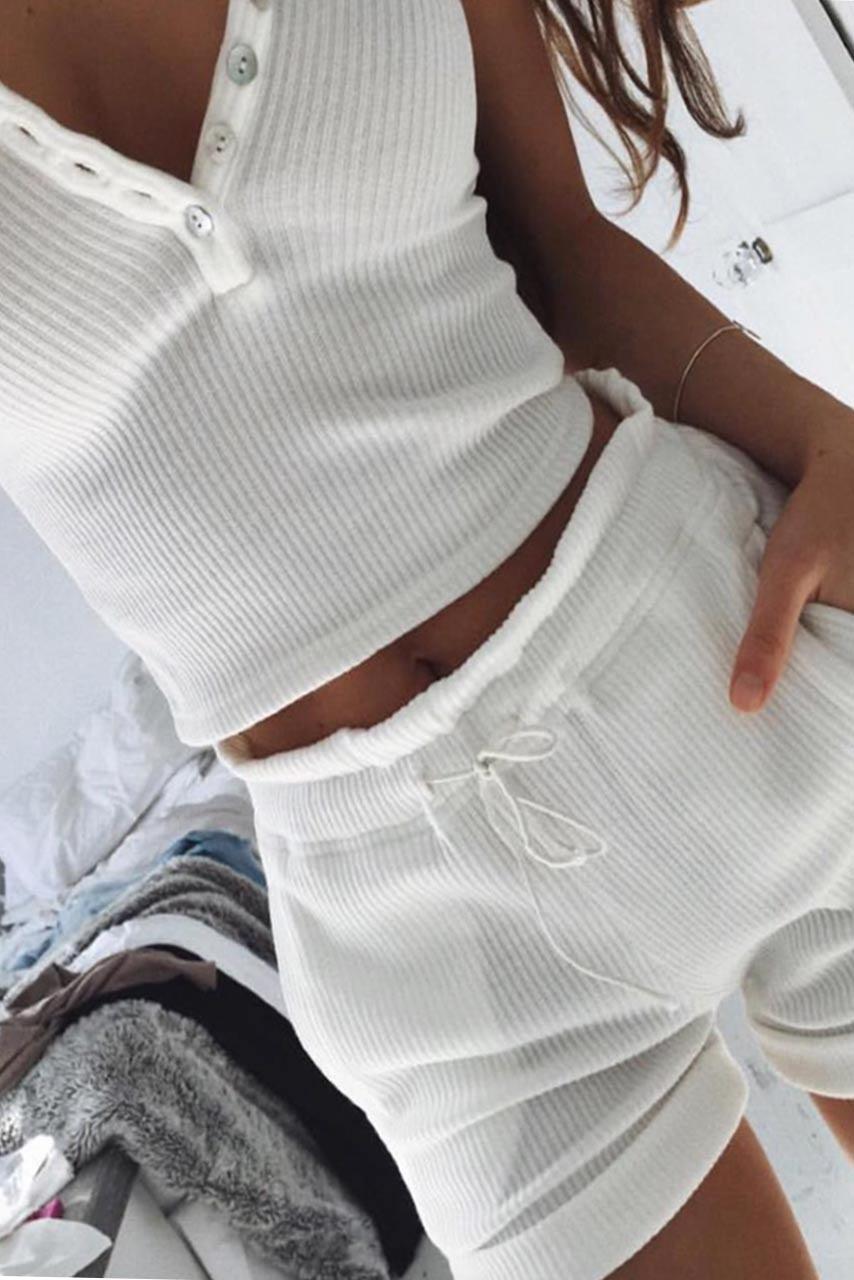 Casual rib all day αμάνικο σετ σε λευκή απόχρωση με V neck crop top και σορτσάκι με λάστιχο στη μέση.