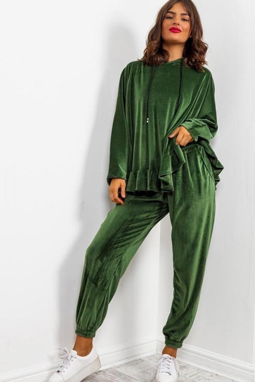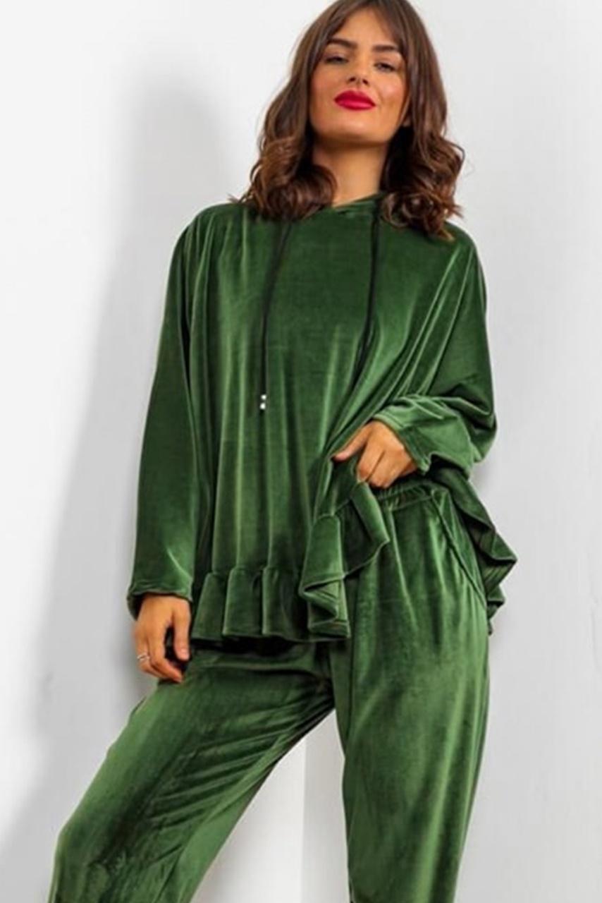 • Σετ O neck top | Τοπ με βολάν και κουκούλα | Παντελόνι με λάστιχο στη μέση και στο τελείωμα