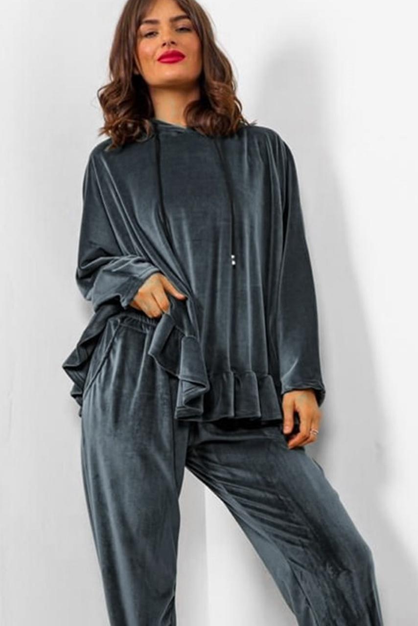 • Σετ O neck top | Τοπ με βολάν και κουκούλα | Παντελόνι με λάστιχο στη μέση και στο τελείωμα
