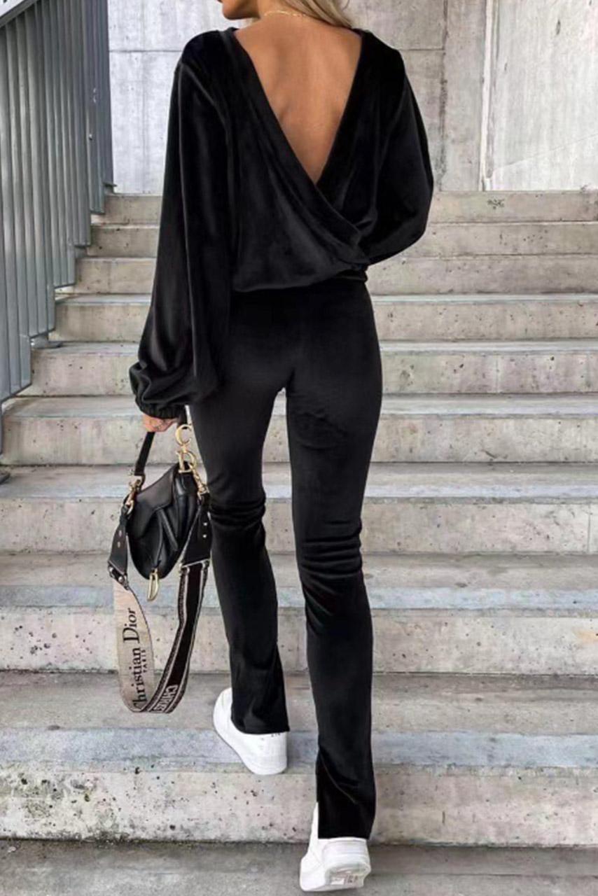 Casual chic all day βελουτέ σετ φόρμας σε μαύρο χρώμα με μακρυμάνικο V neck τοπ και παντελόνι με λάστιχο στη μέση.