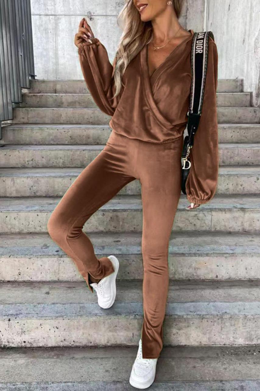 Casual chic all day βελουτέ σετ φόρμας σε καφέ χρώμα με μακρυμάνικο V neck τοπ και παντελόνι με λάστιχο στη μέση.