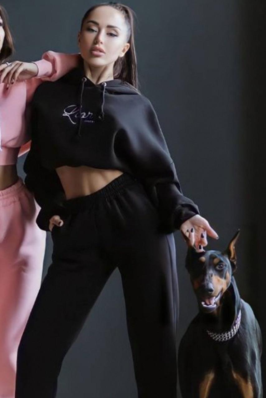 Workout crop σετ φόρμας all day σε μαύρο χρώμα με κουκούλα και λάστιχο σε τοπ και παντελόνι.
