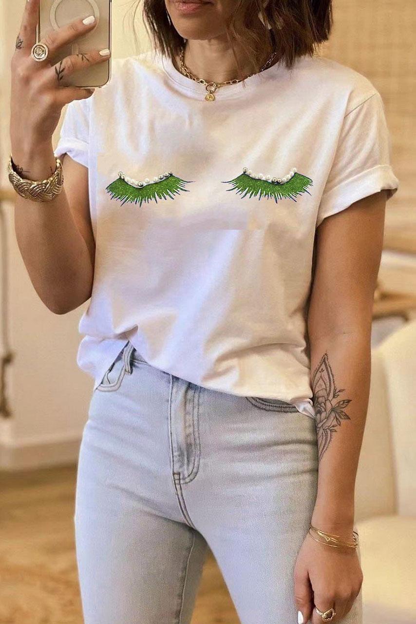 Pop girly casual t shirt σε λευκό χρώμα με στάμπα 3d σε πράσινη απόχρωση και μικρά all over strass.