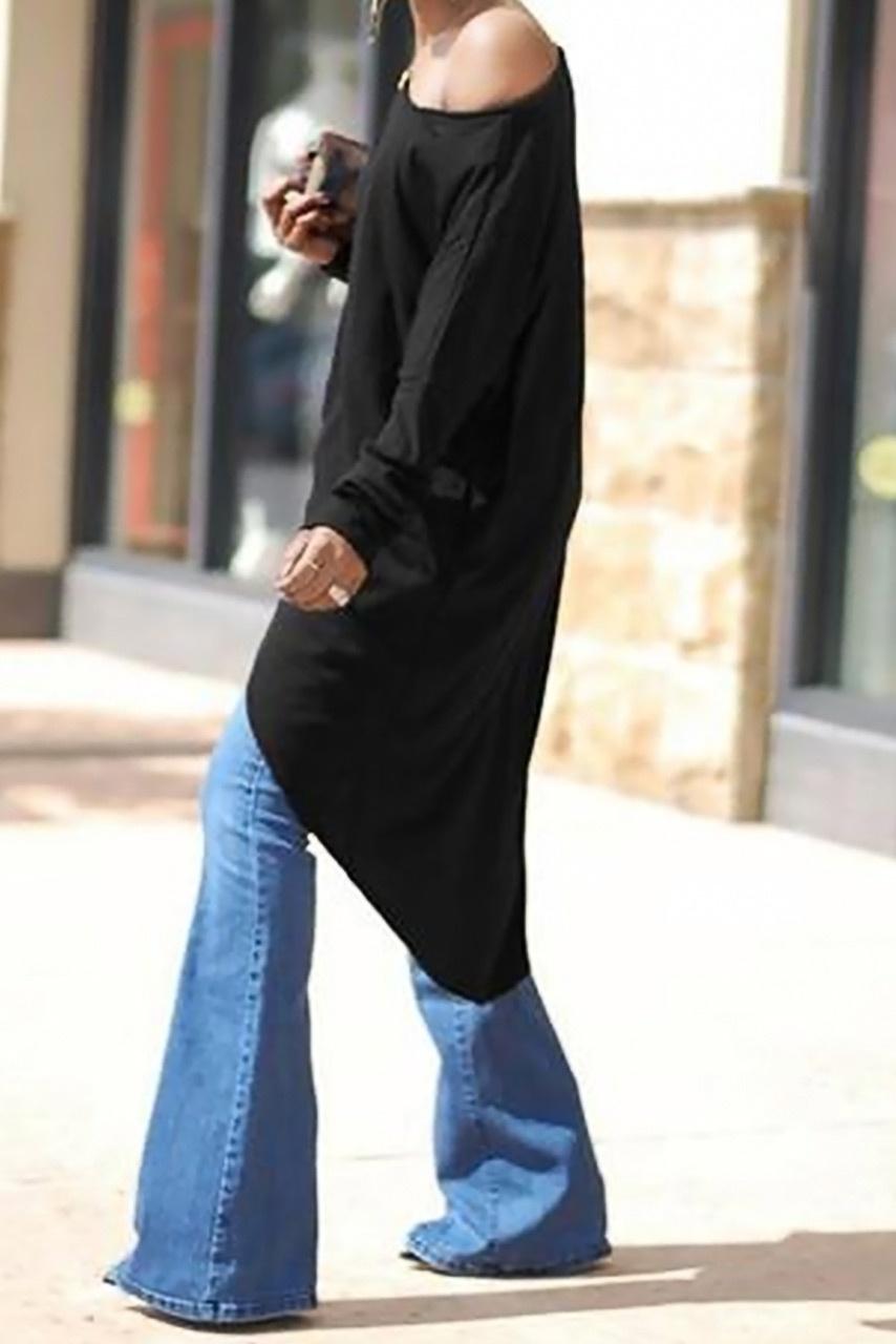 Μαύρο μπλουζοφόρεμα πλεκτό με ασύμμετρο σκίσιμο και στρογγυλή ανοιχτή λαιμόκοψη.