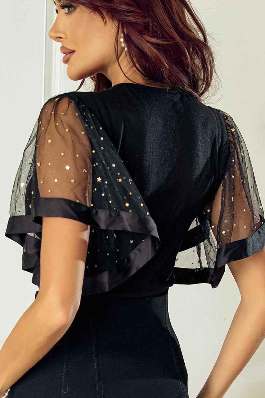 Glam U neck μπλούζα με βολάν μανίκι από τούλι με αστεράκια και ανοιχτή λαιμόκοψη.