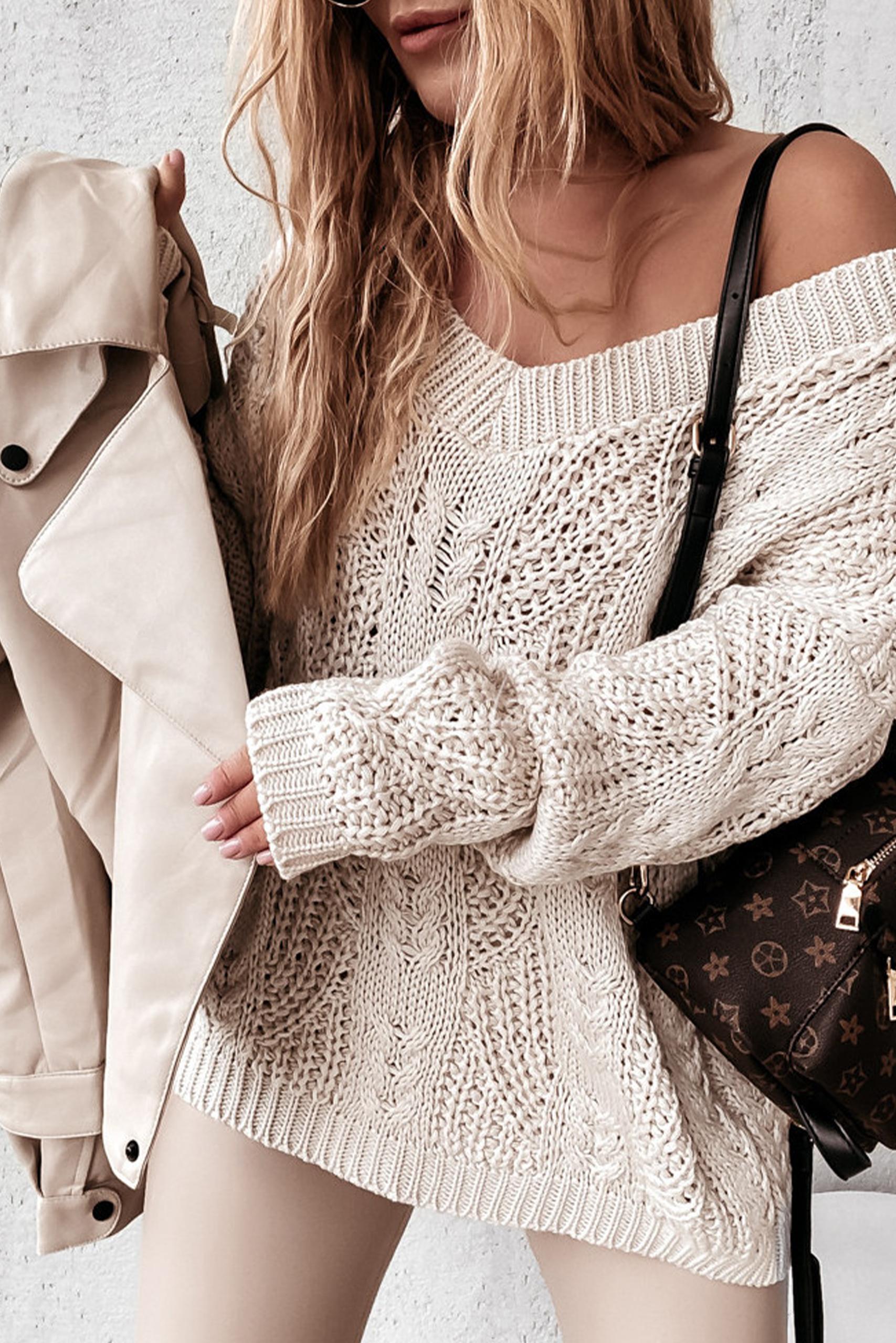 Braided drop shoulder jumper σε δύο αποχρώσεις με V neck λαιμόκοψη και χοντρή πλέξη.