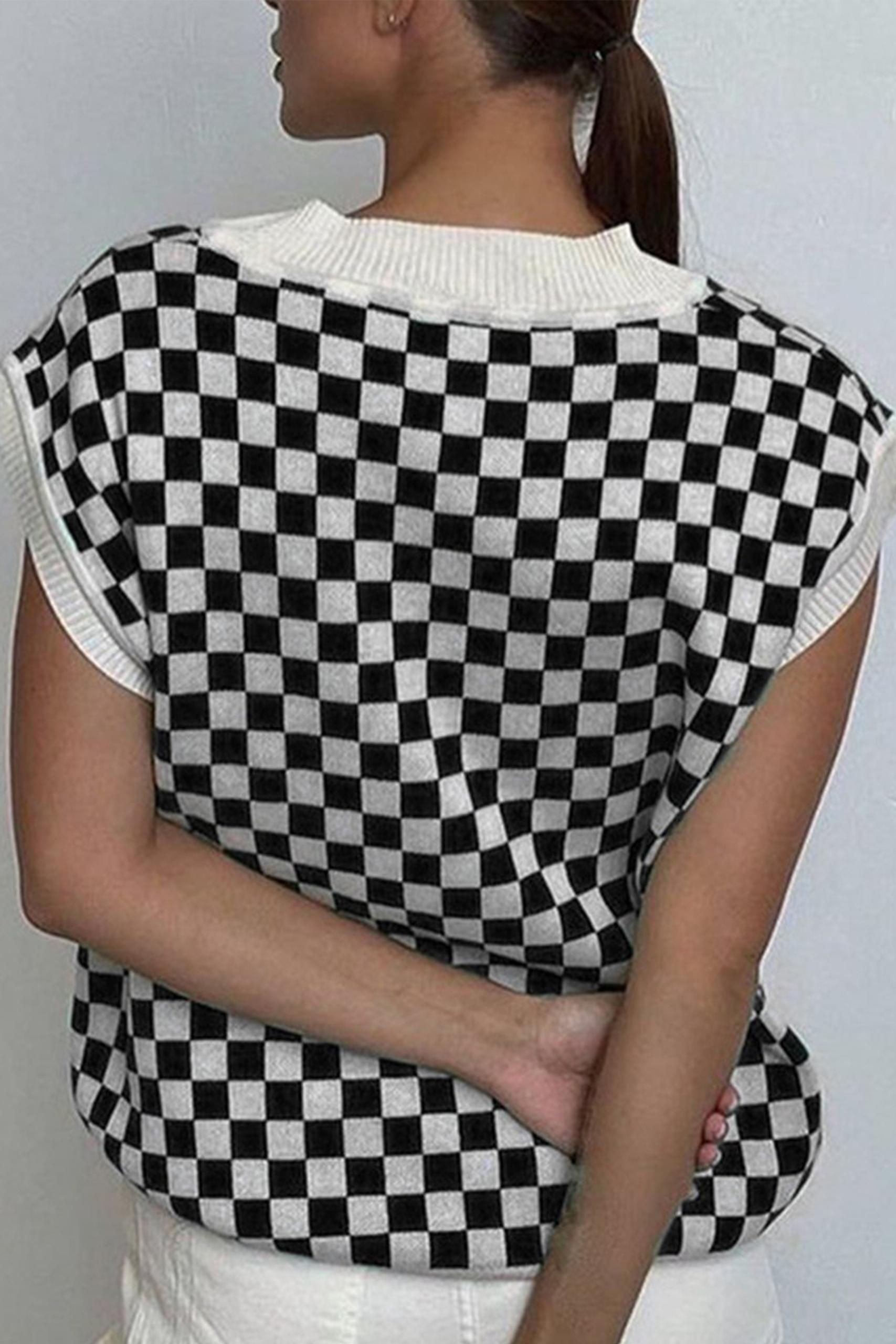 Checkered sweater vest V neck αμάνικη σκακιέρα καζάκα σε λευκό-μαύρο. Συνδυάστε το με τη μίνι Leather πλισέ φούστα ή τη μακριά Pleated δερμάτινη φούστα μαύρη για μοναδικό street look.