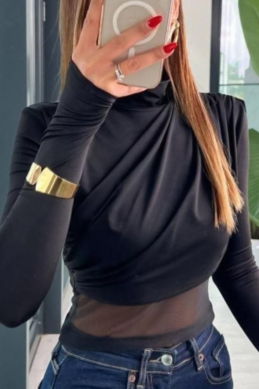 Αυτό το crop top είναι ένα κομμάτι που θα κλέψει τις εντυπώσεις. Είναι μακρυμάνικο με λεπτομέρειες διαφάνειας και μικρό ζιβάγκο.