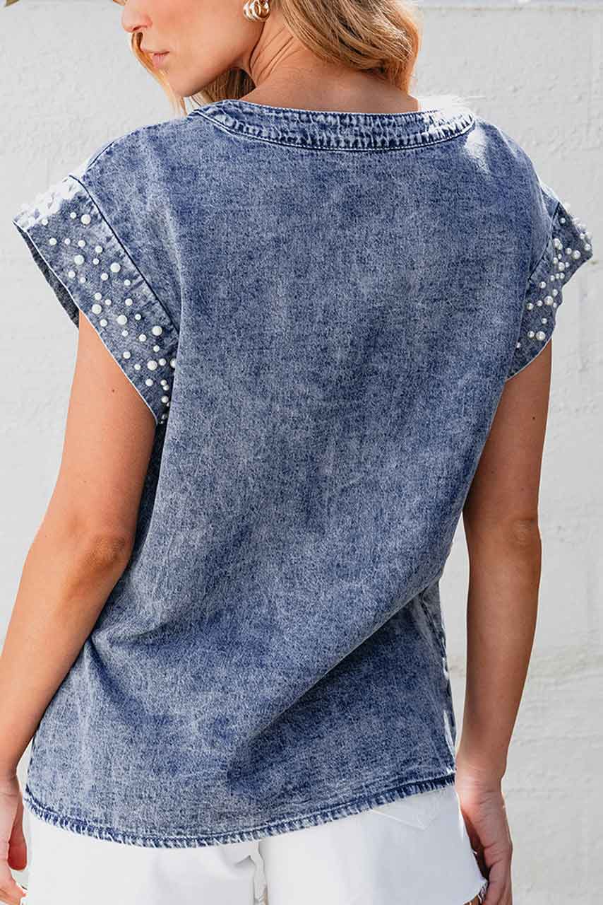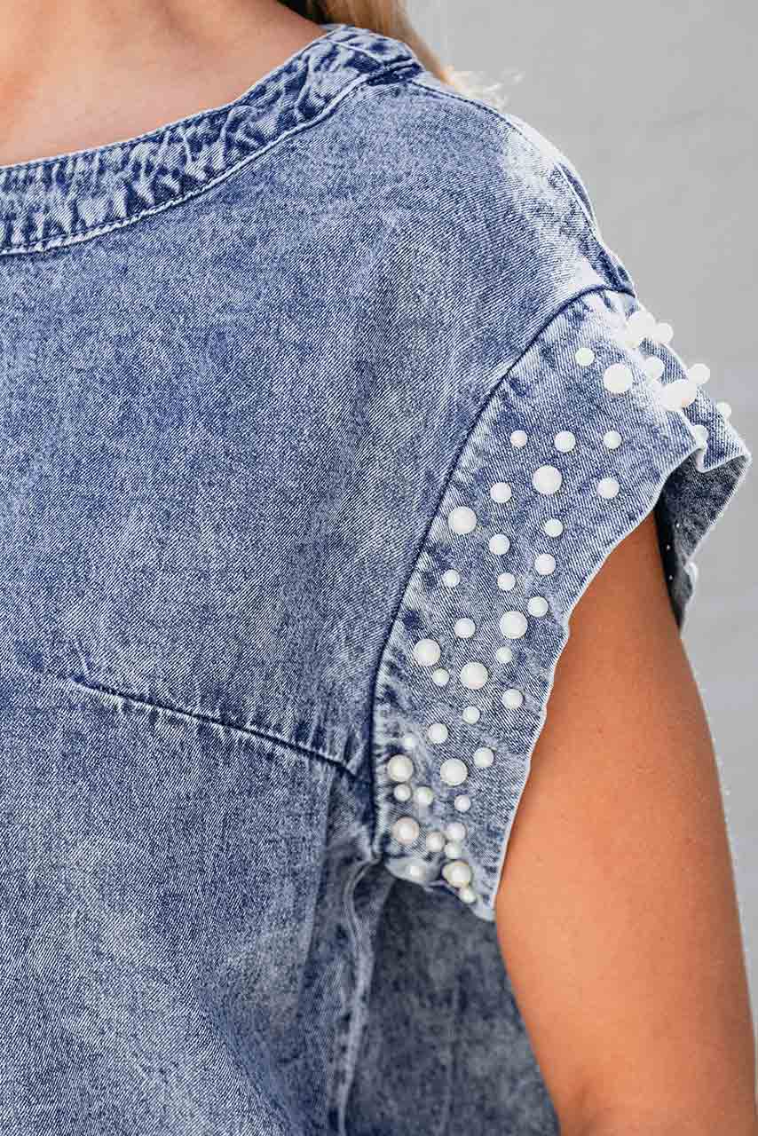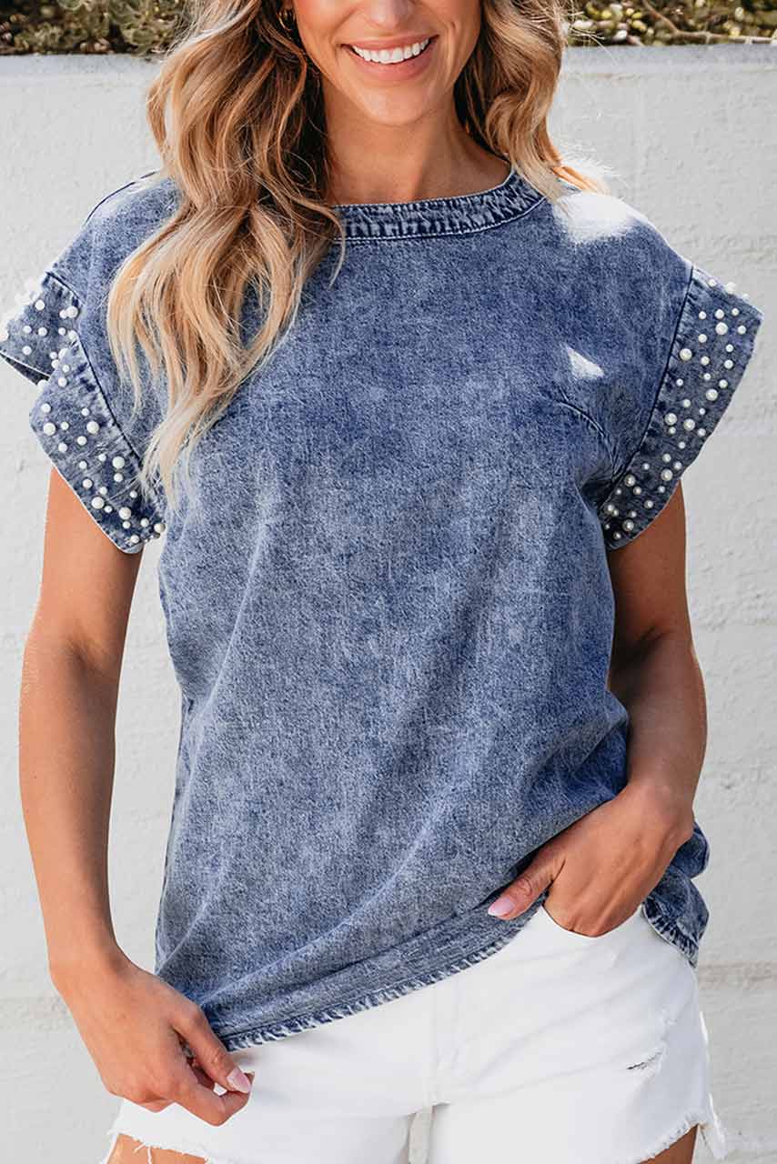 Denim μπλε τοπ με πέρλες στα μανίκια