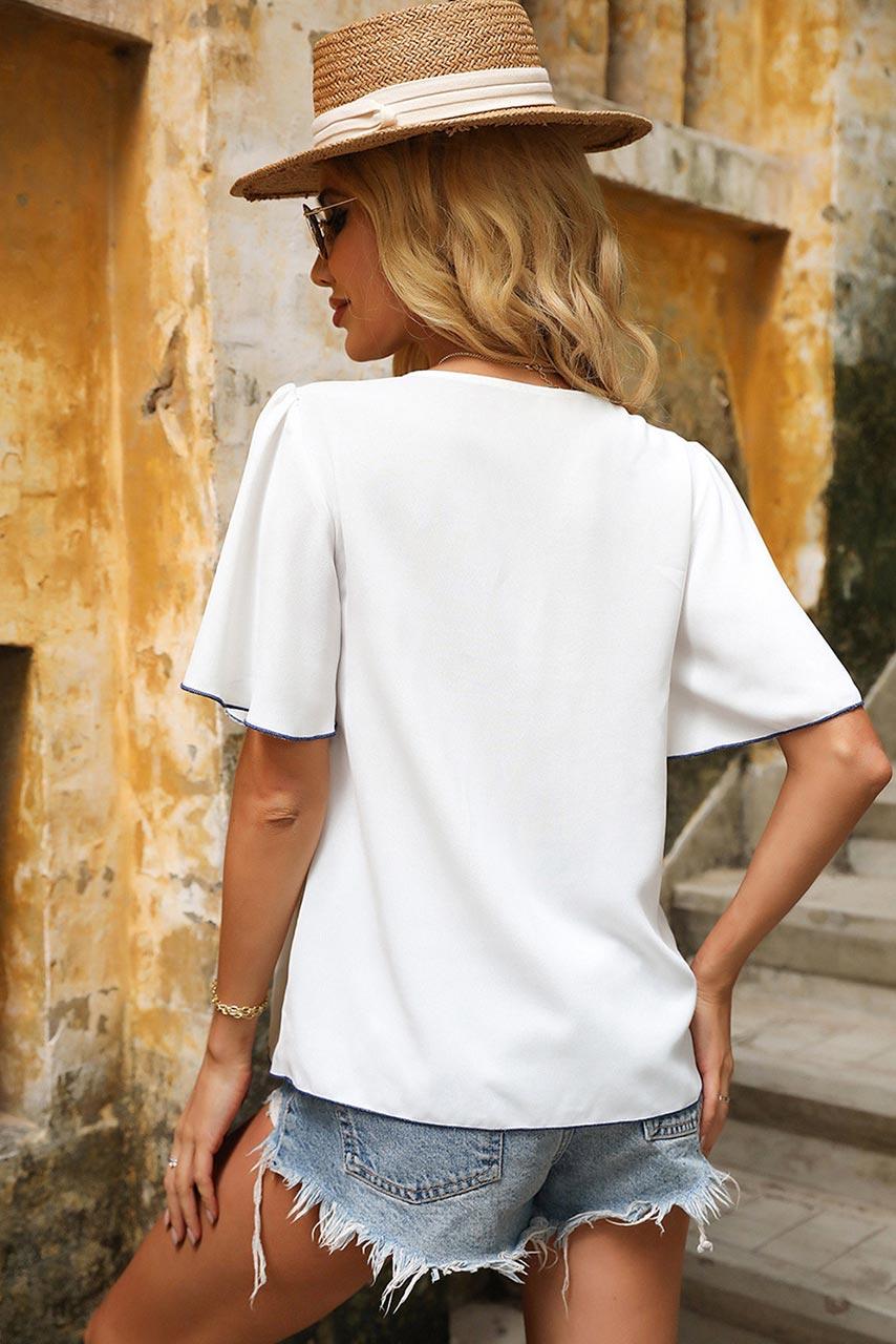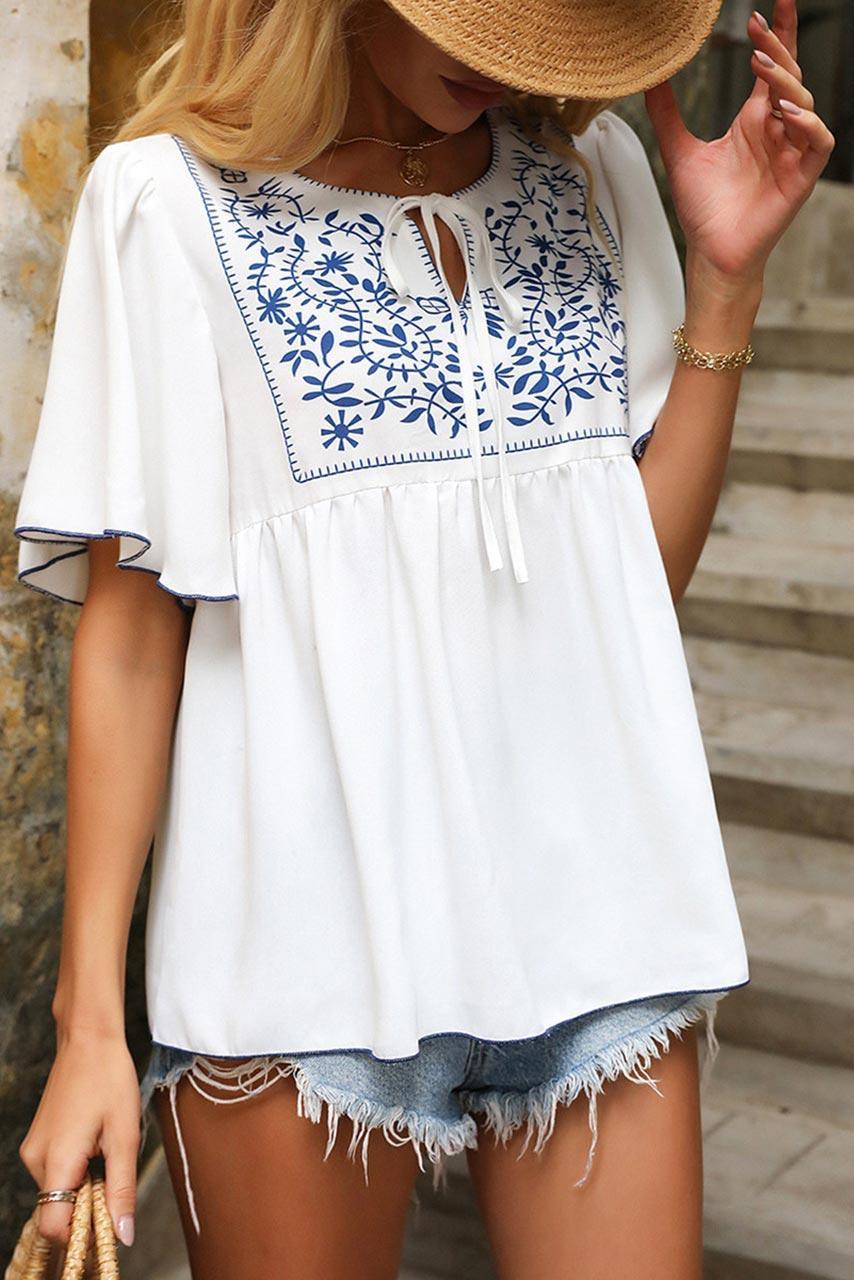 Ethnic chic κοντομάνικη μπλούζα με κέντημα on top σε λευκή απόχρωση με μπλε ύφανση.