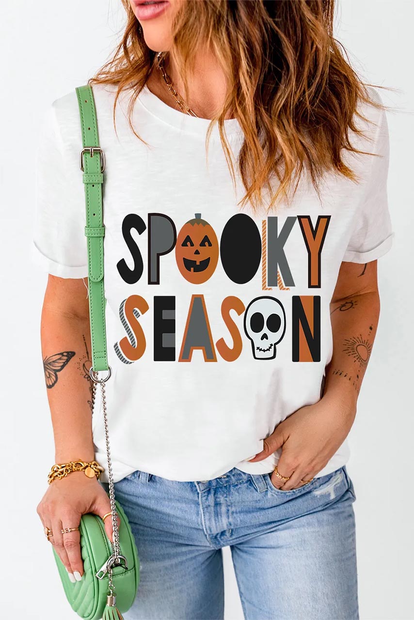 • Λευκό χρώμα | Γραφικό κολοκύθας και κρανίου “SPOOKY SEASON” | Στρογγυλή λαιμόκοψη | Κοντά μανίκια