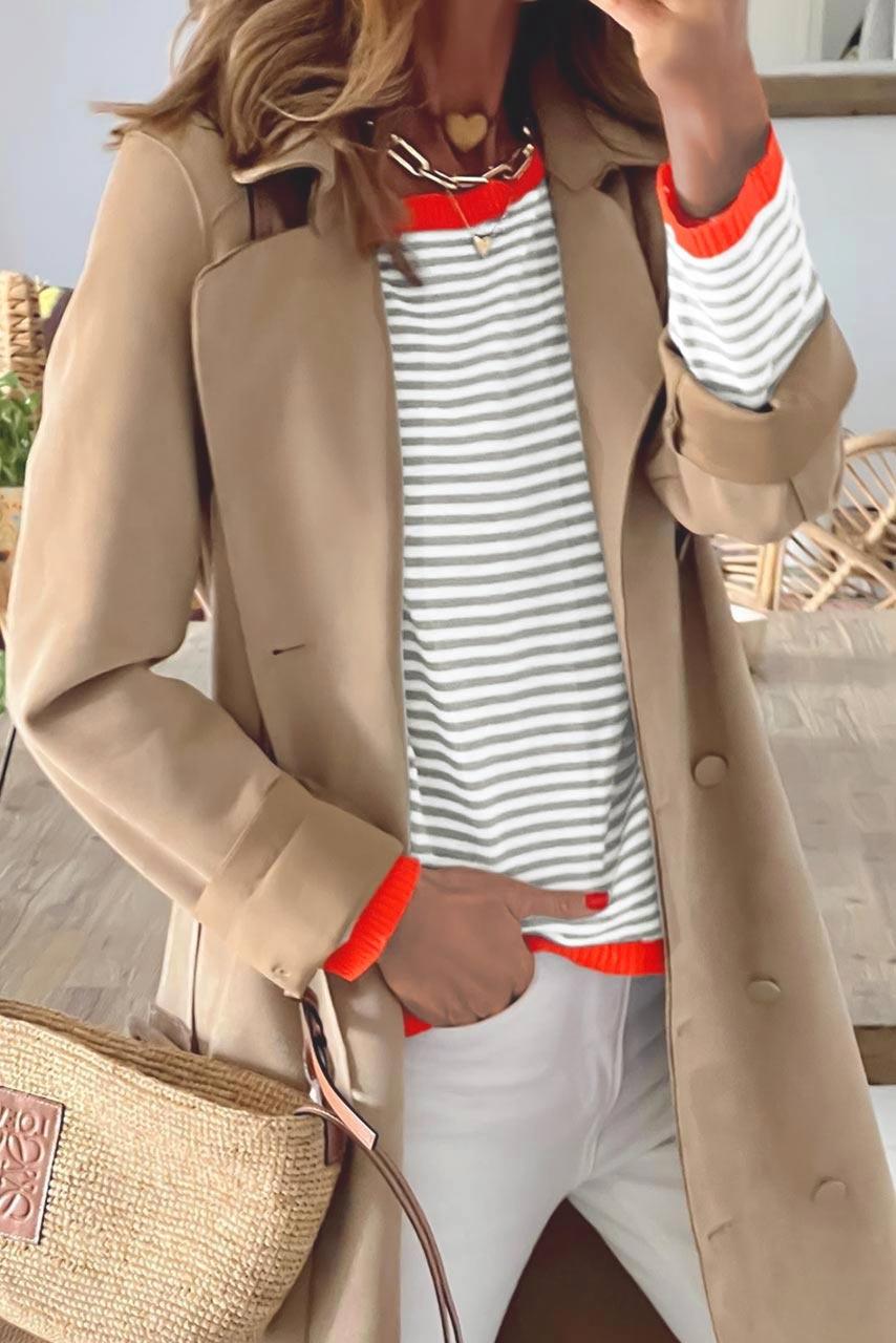 Navy τρίχρωμο ριγέ μπλουζάκι μακρυμάνικο με στρογγυλή λαιμόκοψη, με πορτοκαλί λεπτομέρεια και γκρι ρίγες. Έχει κανονική άνετη γραμμή και βγαίνει σε νουμεράκια από Small μέχρι 2XL.