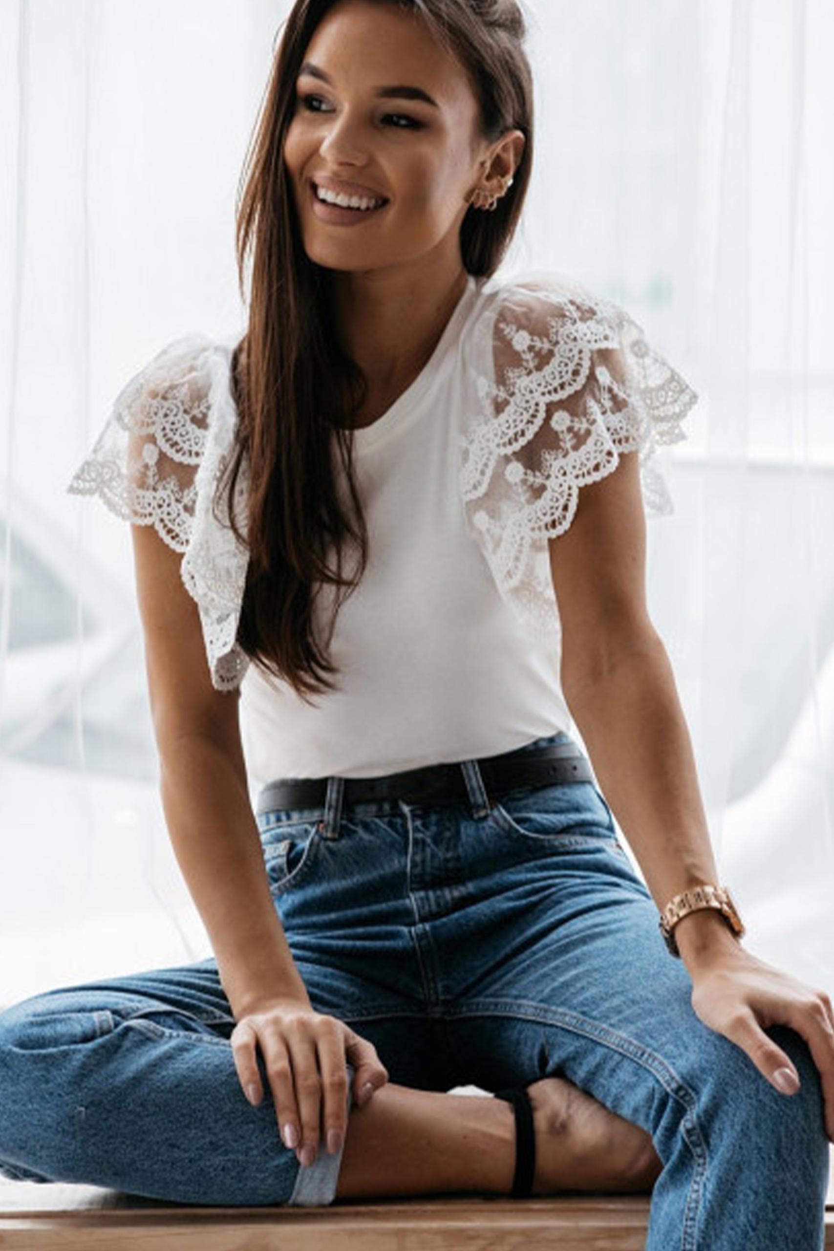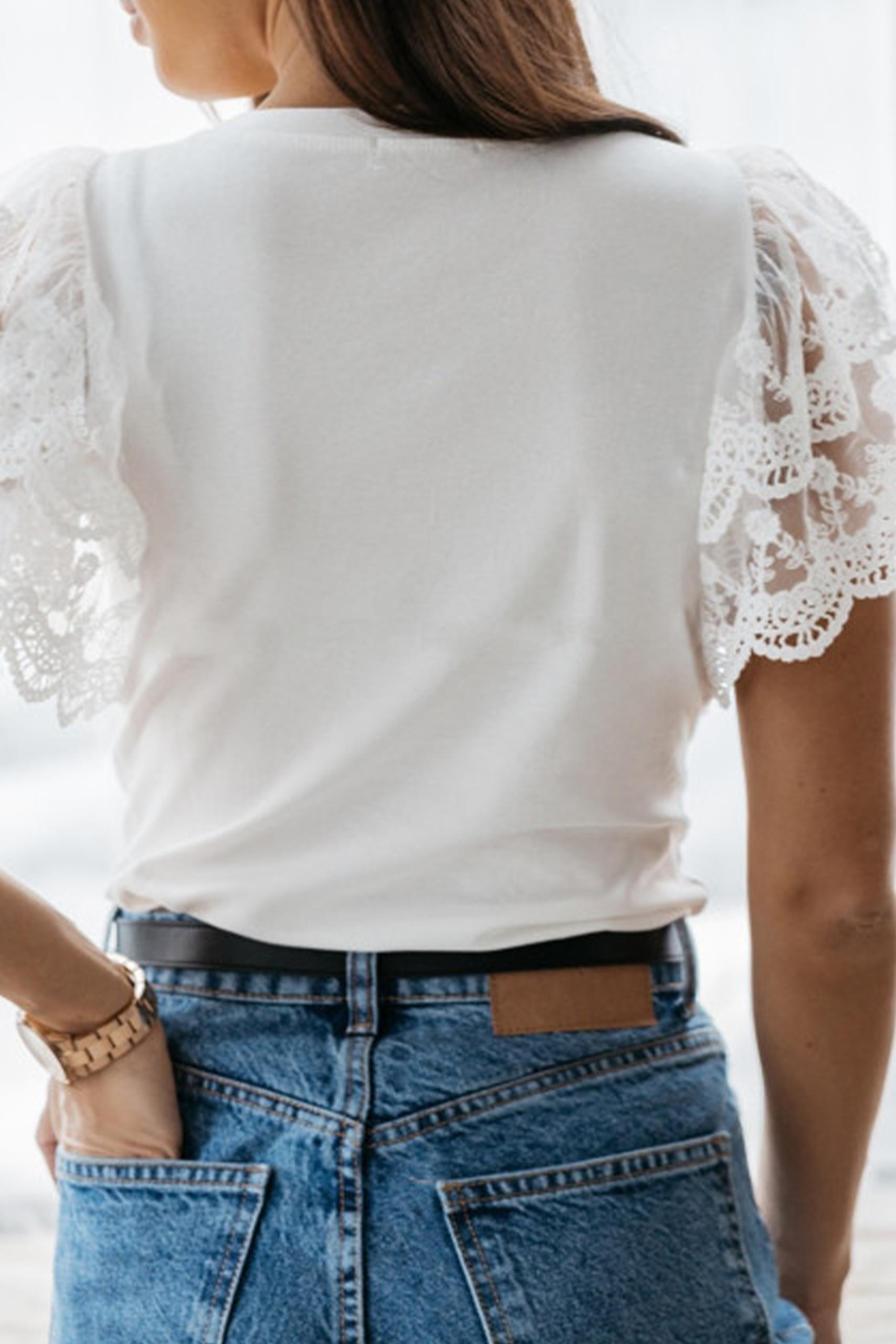 Λευκό t- shirt με λαιμόκοψη και λεπτομέρεια μανίκια από mesh δαντέλα.