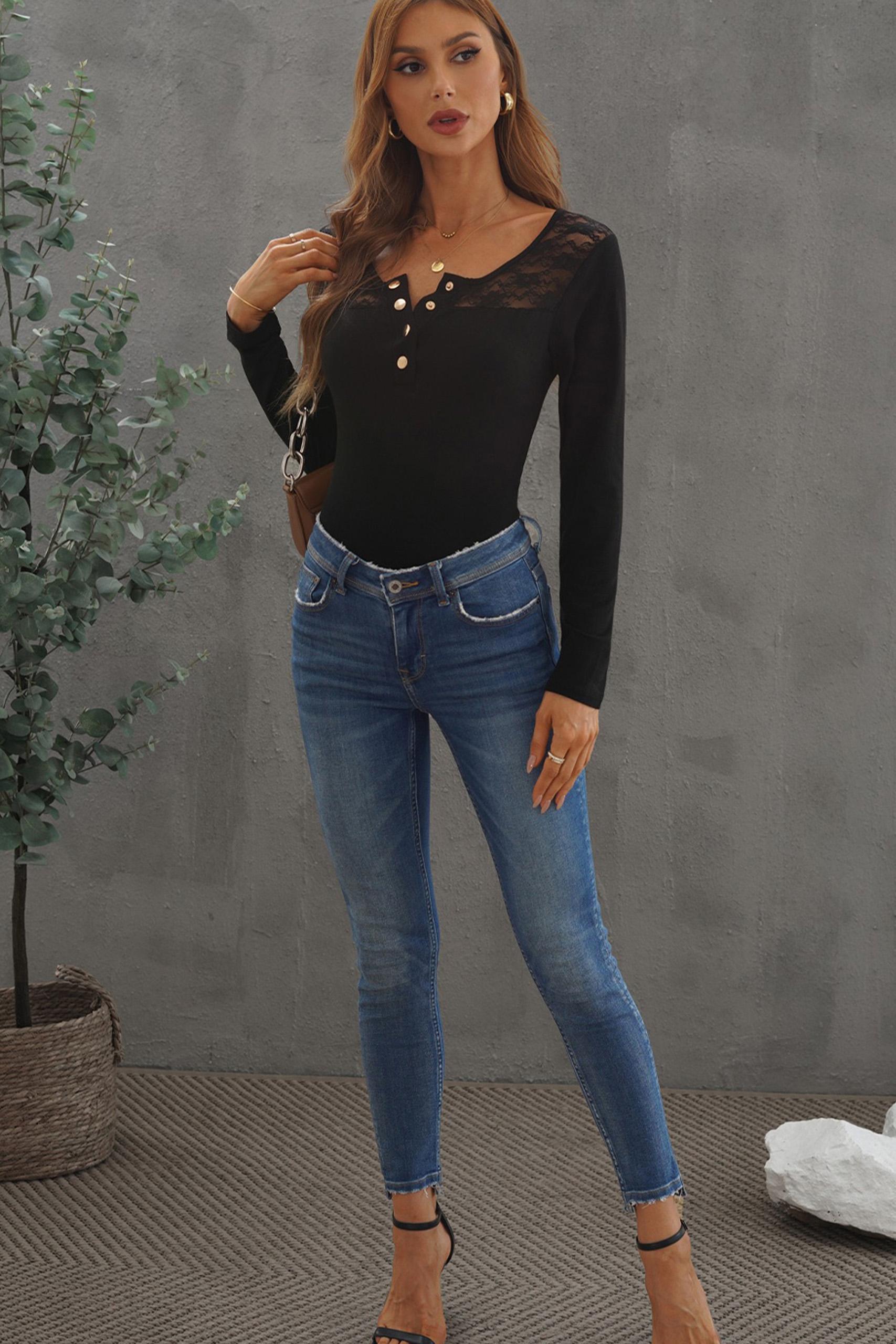 Lace detail top μπλούζα με λαιμόκοψη χαμόγελο και λεπτομέρεια δαντέλας σε τρεις αποχρώσεις με χρυσά κουμπιά κατά μήκος.