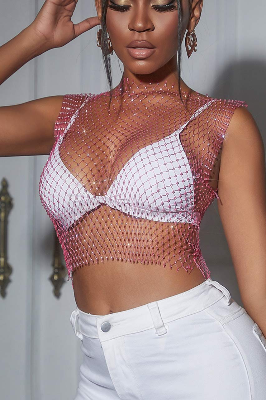 Διχτυωτό crop top με στράς φούξια