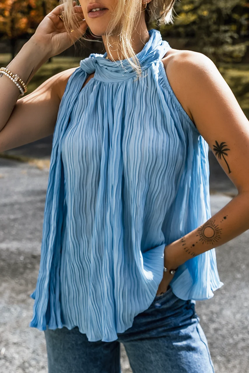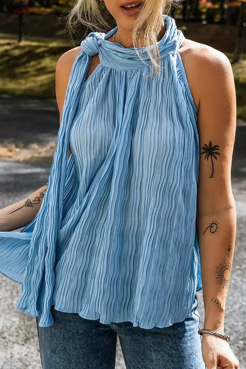 Ανανέωσε τη γκαρνταρόμπα σου με αυτή τη μοναδική γαλάζια μπλούζα, σχεδιασμένη για αέρινες και κομψές εμφανίσεις. Το ανάλαφρο πλισέ ύφασμα προσφέρει αίσθηση δροσιάς και κίνησης, ενώ το εντυπωσιακό δέσιμο στον λαιμό δημιουργεί ένα ιδιαίτερο twist που αναδεικνύει το ντεκολτέ. Το loose fit κόψιμο της την καθιστά ιδανική για καθημερινά casual looks αλλά και πιο προσεγμένες εμφανίσεις. Φόρεσέ την με τζιν, υφασμάτινα παντελόνια ή ακόμα και ψηλόμεσες φούστες για ένα effortless chic αποτέλεσμα.