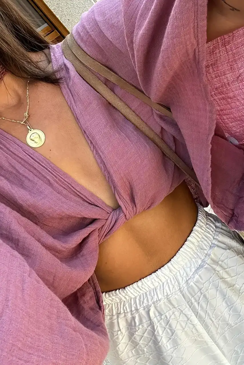 Η μπλούζα που αποπνέει ανεπιτήδευτο καλοκαιρινό στυλ είναι εδώ για να ανανεώσει την κάθε σου εμφάνιση! Με μωβ χρώμα που αναδεικνύει το μαύρισμα και κόμπο στο στήθος για έξτρα θηλυκότητα, αυτή η μπλούζα συνδυάζει χαλαρή εφαρμογή και boho αίσθηση. Το ελαφρύ ύφασμα τύπου λινό «αγκαλιάζει» το σώμα χωρίς να το βαραίνει, ενώ τα φαρδιά μανίκια προσδίδουν κίνηση και κομψότητα σε κάθε βήμα.