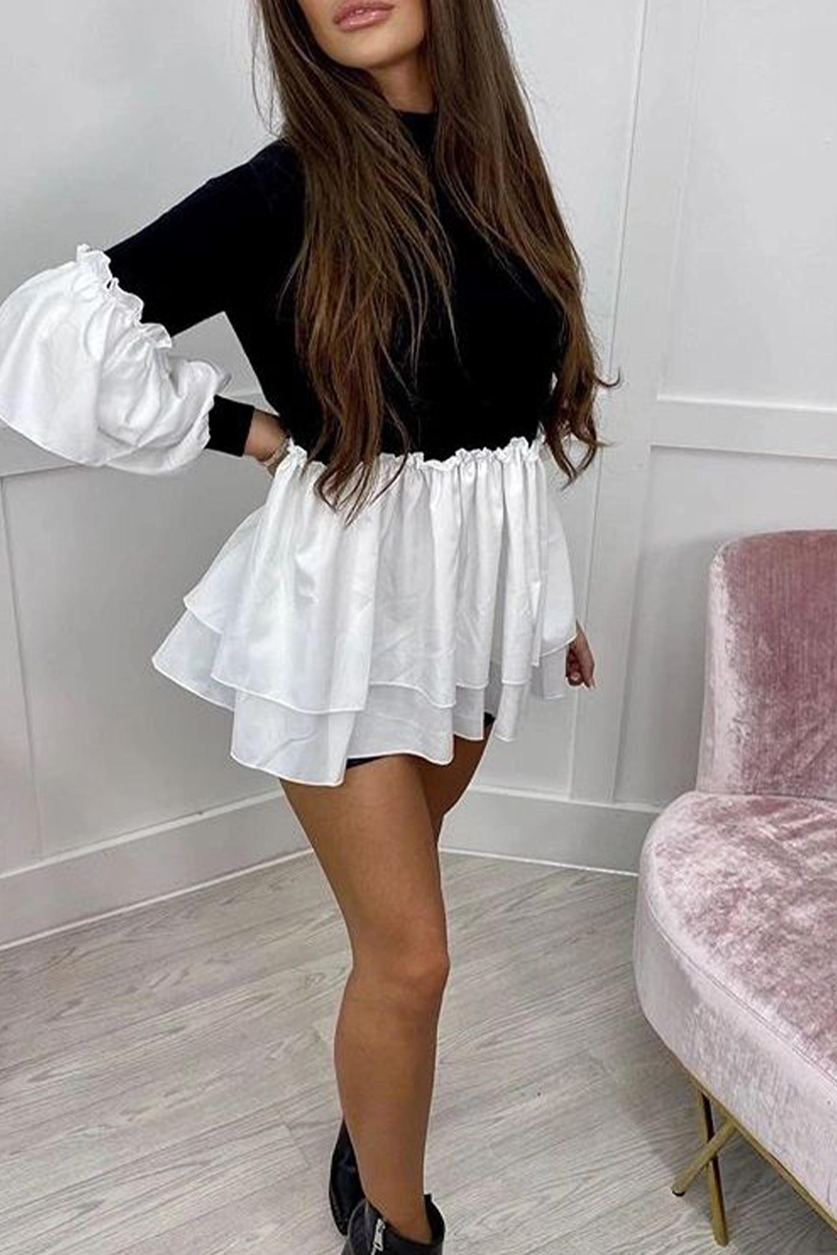 Peplum style τοπ-φόρεμα σε δύο αποχρώσεις, με διπλό layering, rib υφή on top και ασύμμετρο λευκό βολάν στο κάτω μέρος.