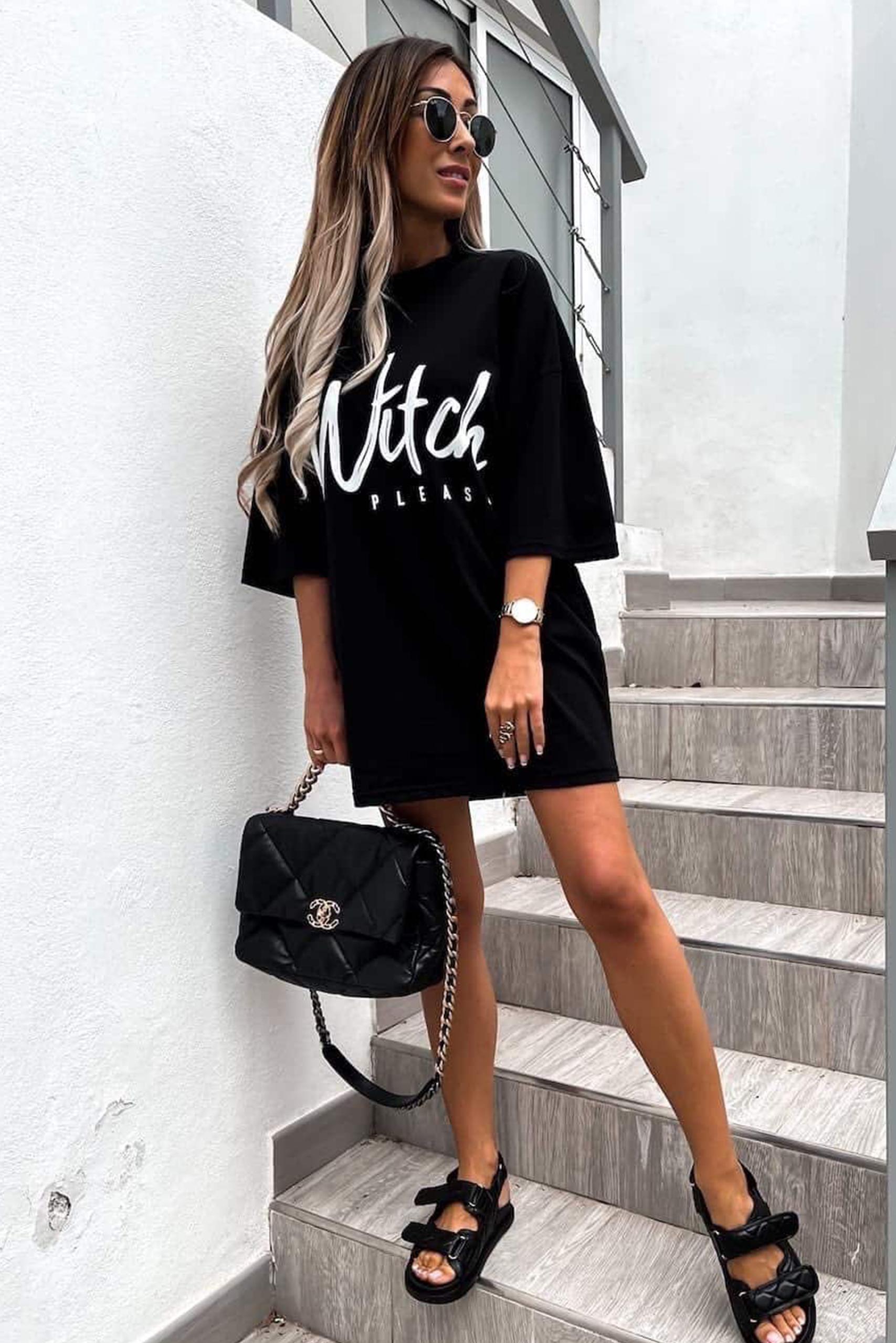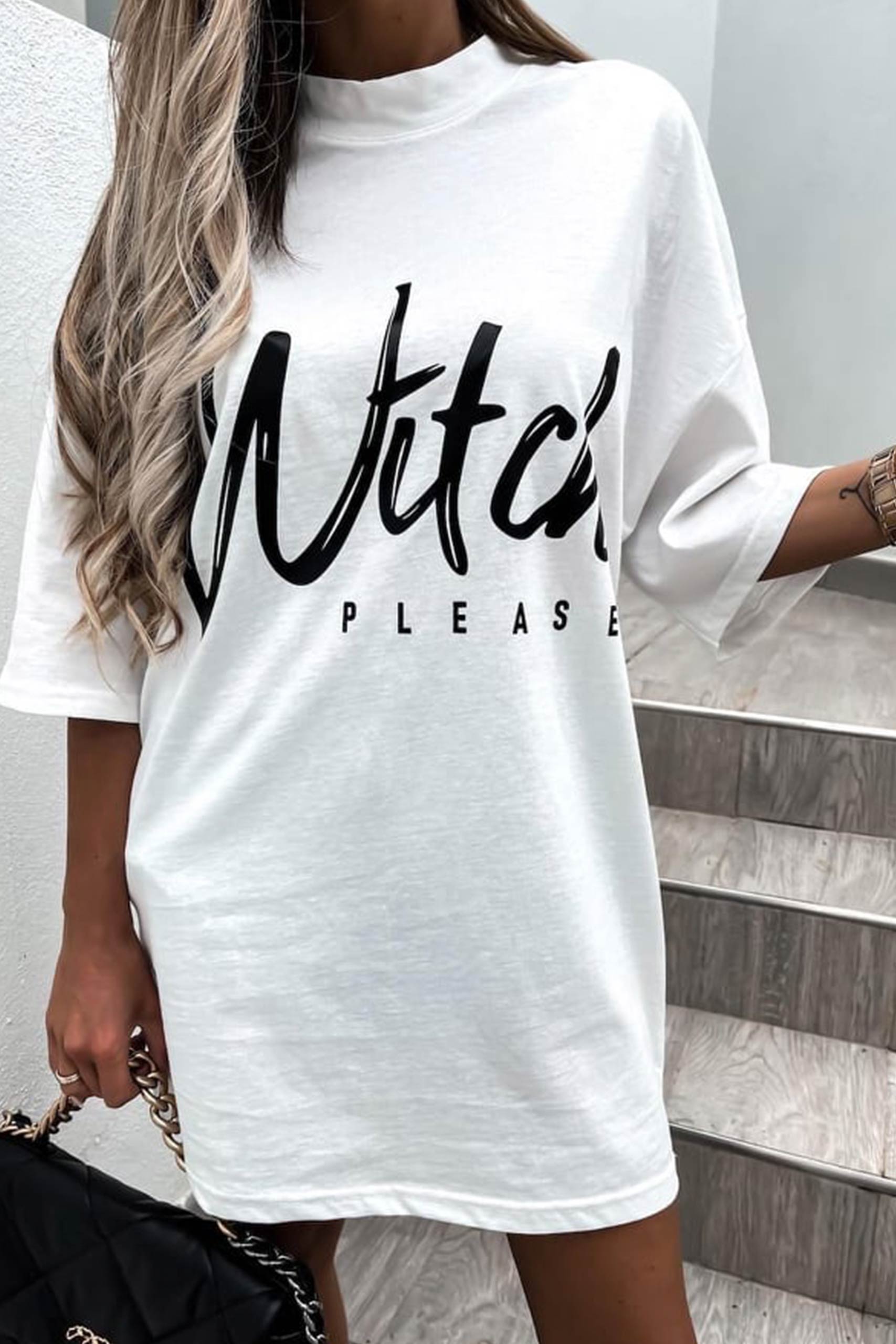Oversized print t-shirt φόρεμα σε μαύρο χρώμα με λευκή στάμπα και σε λευκό χρώμα με μαύρη στάμπα.