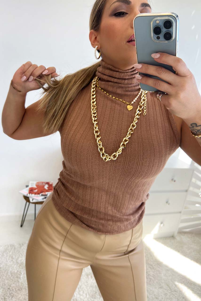 Office glam ζιβάγκο rib top αμάνικο σε καφέ απόχρωση.