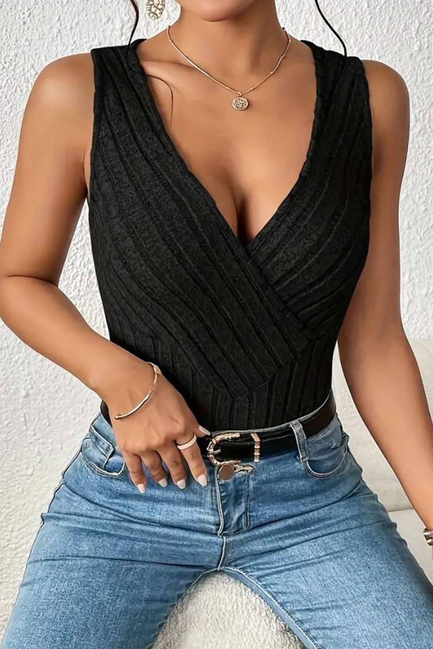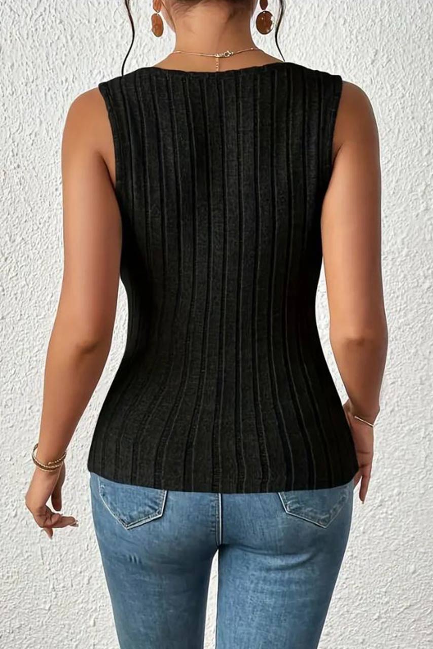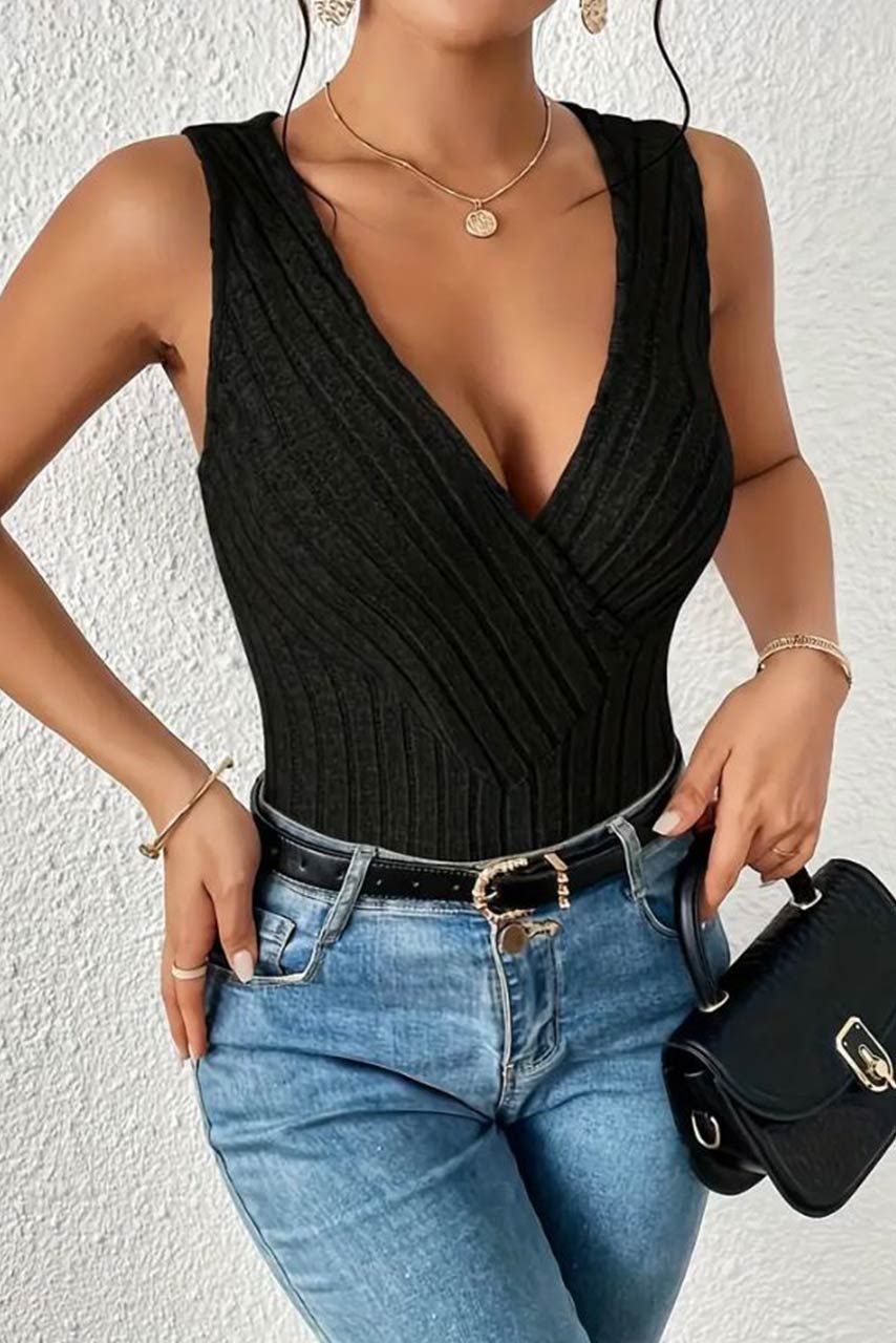 Μαύρο αμάνικο τοπάκι σε rib ύφανση με σταθερές τιράντες και V άνοιγμα μπροστά. Ένα τοπάκι για αμέτρητους συνδυασμούς, το φετινό καλοκαιρινό must!
