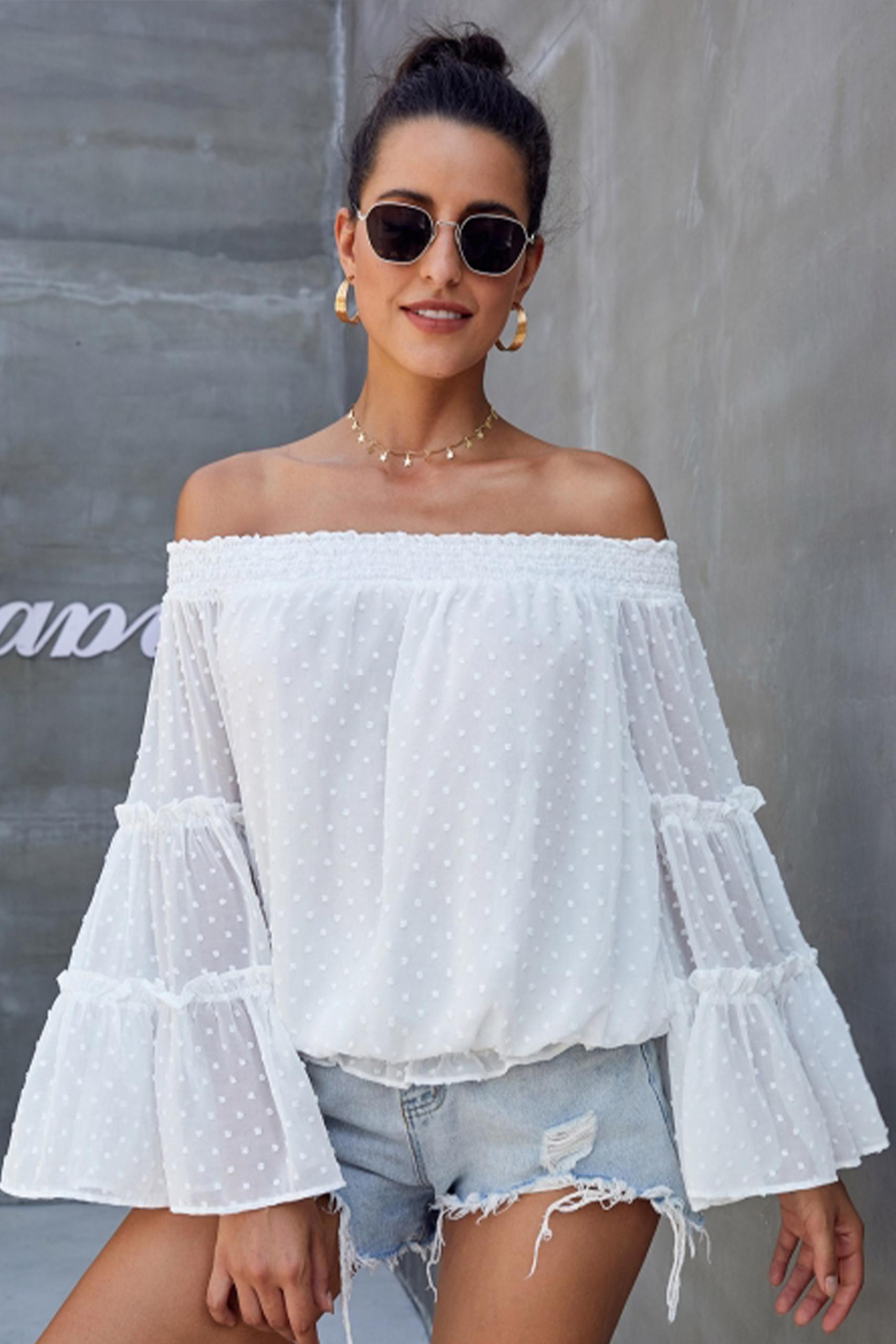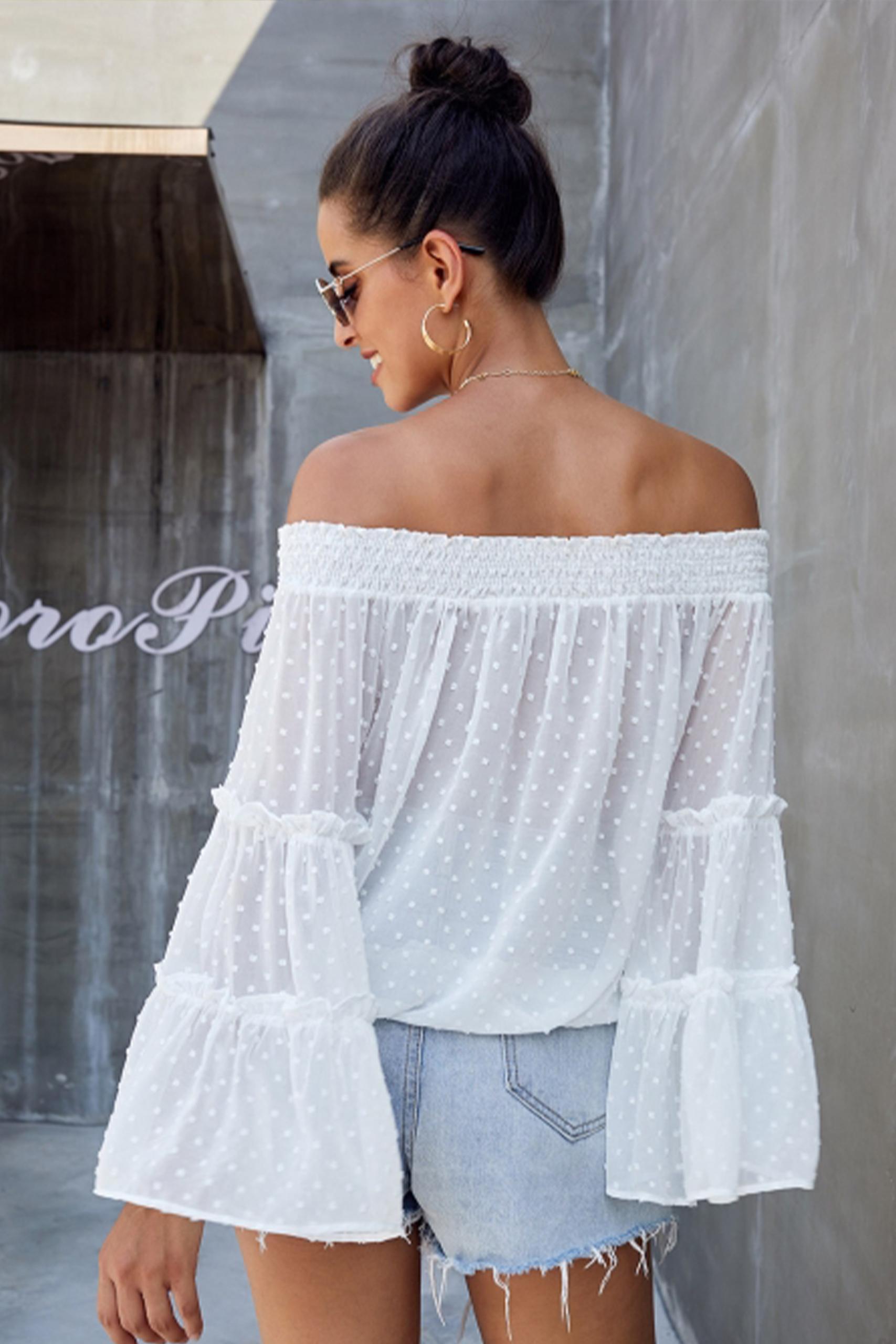 ‘Εξωμη διάφανη μπλούζα βικτωριανής εποχής με μικρά πουά και μανίκια καμπάνα με σούρες σε λευκό χρώμα.