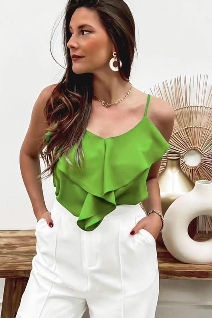 Glam casual ruffle satin τοπ με βολάν σε ανοιχτή πράσινη απόχρωση με μεγάλα φύλλα βολάν στο V και πολύ λεπτές τιράντες.