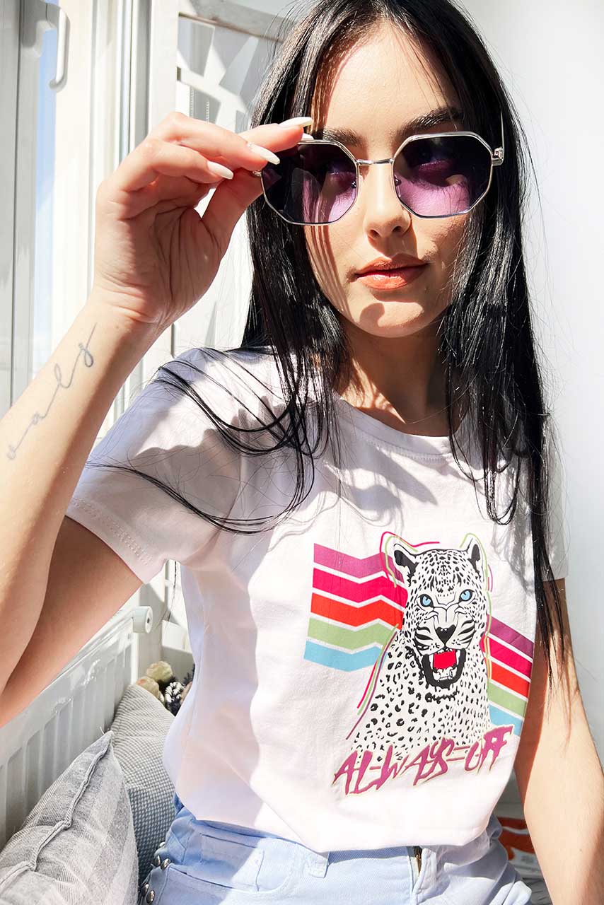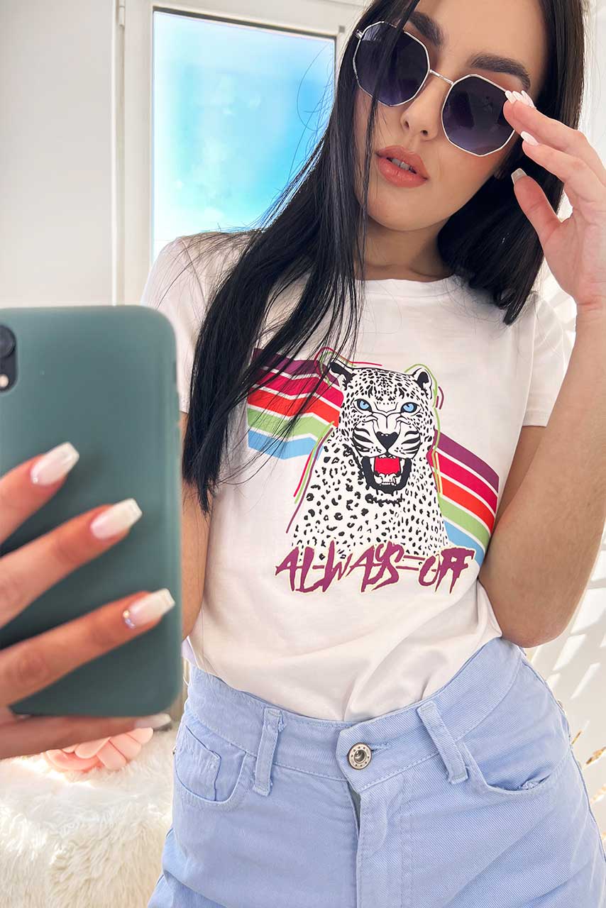 Pop girly κοντομάνικο t shirt με στάμπα σε λευκή απόχρωση με πολύχρωμο σχέδιο.