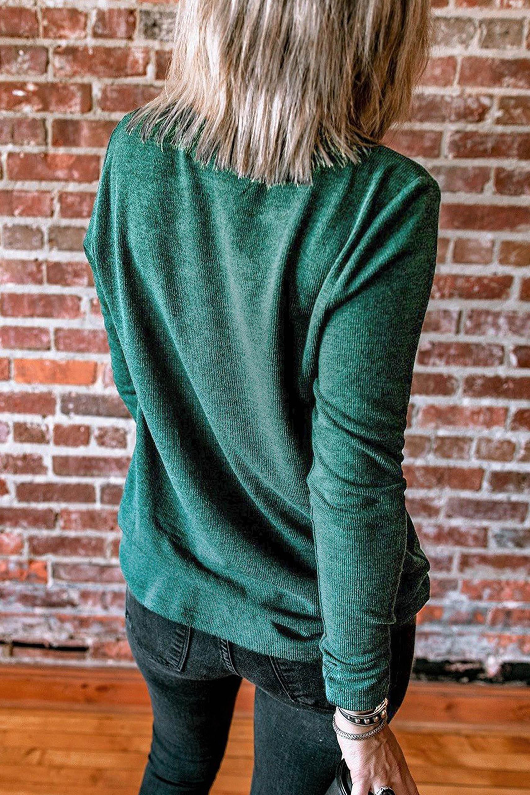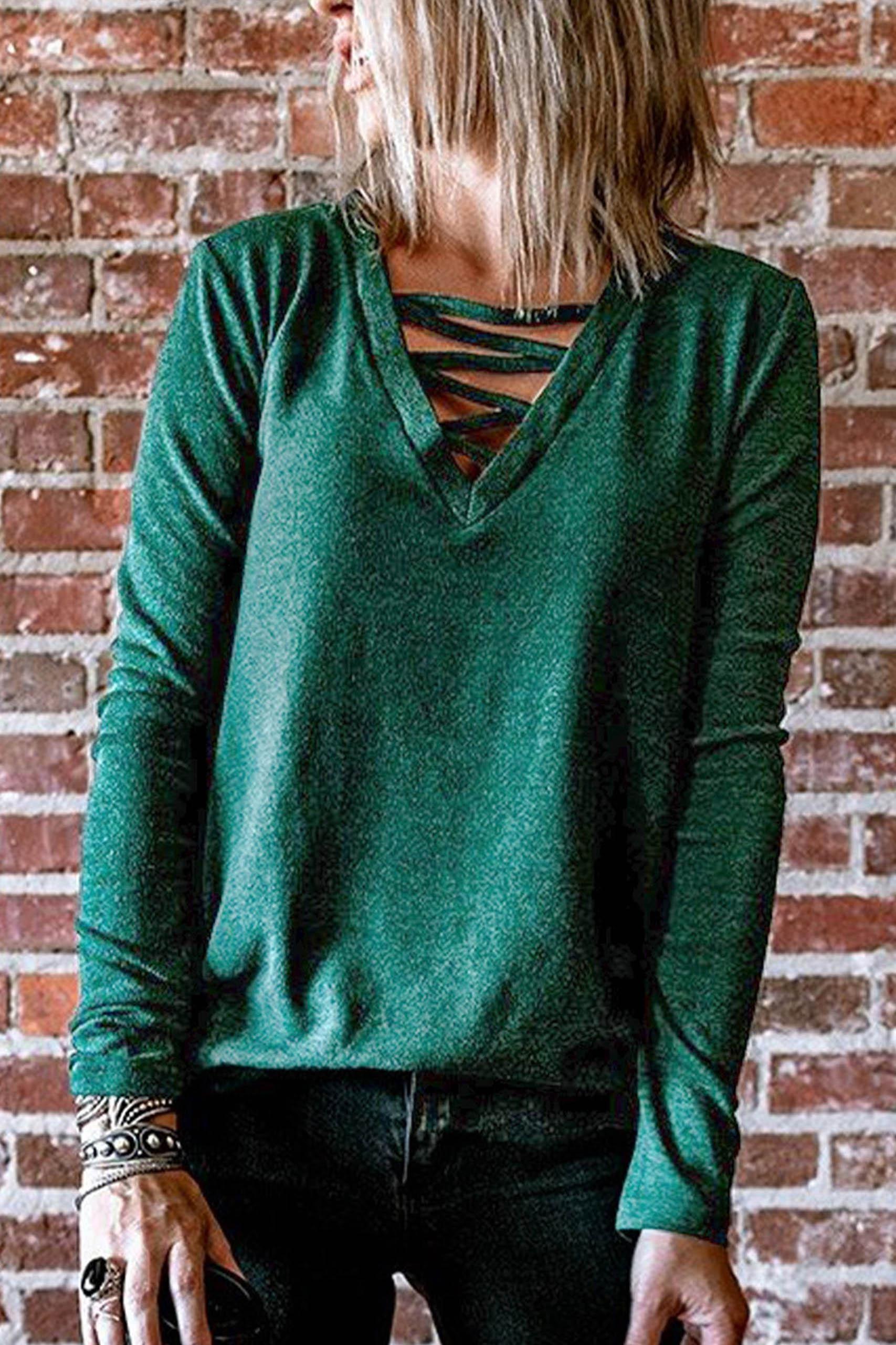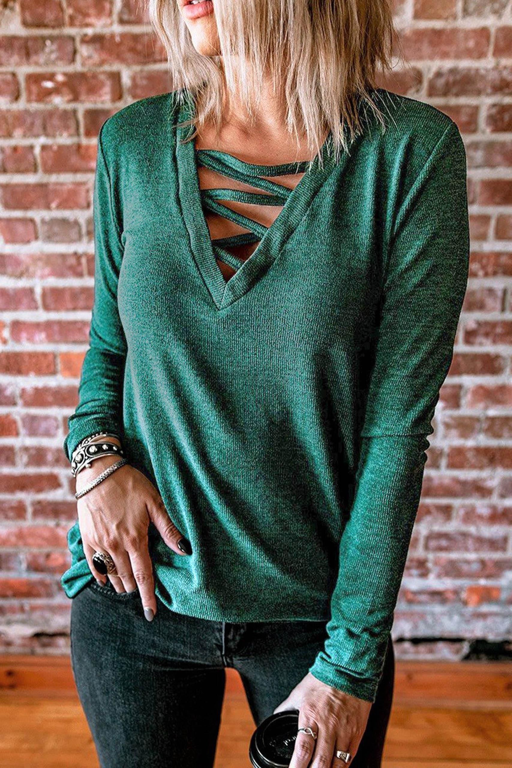 Strappy details neck μπλούζα μακρυμάνικη με ραμμένα κορδόνια on top σε πράσινο χρώμα.