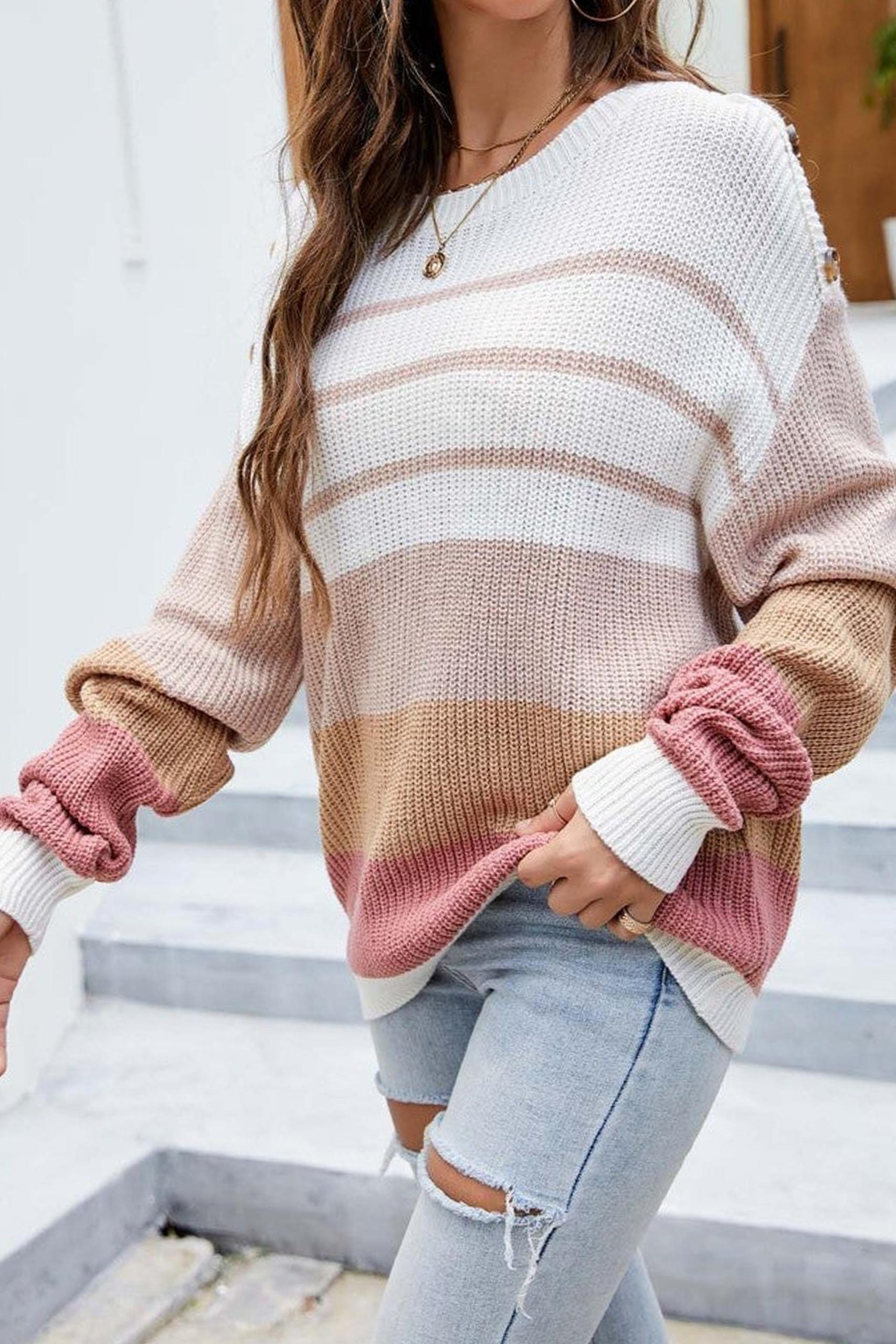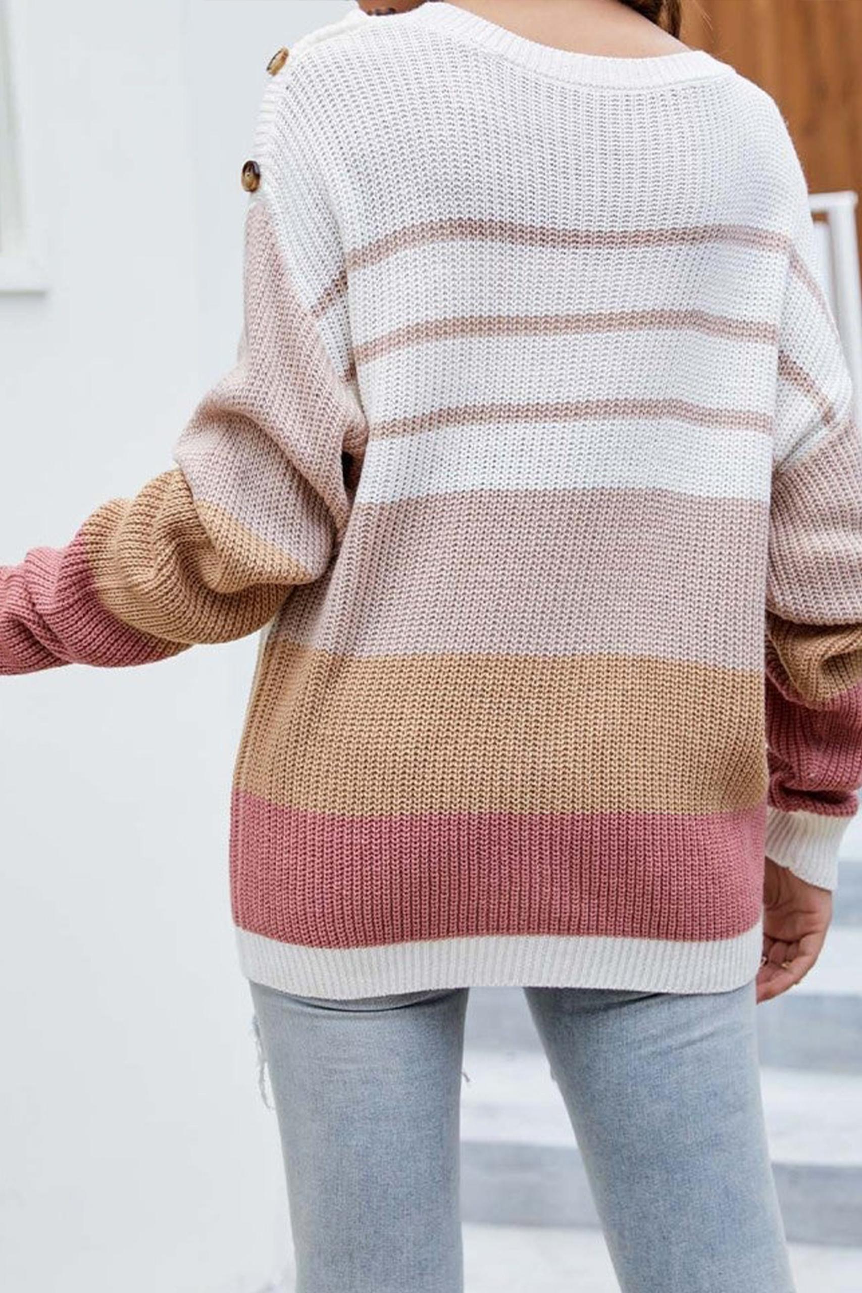 Ριγέ πουλόβερ σε παλ αποχρώσεις με V neck και λεπτομέρεια σειρά retro κουμπιά στους ώμους.