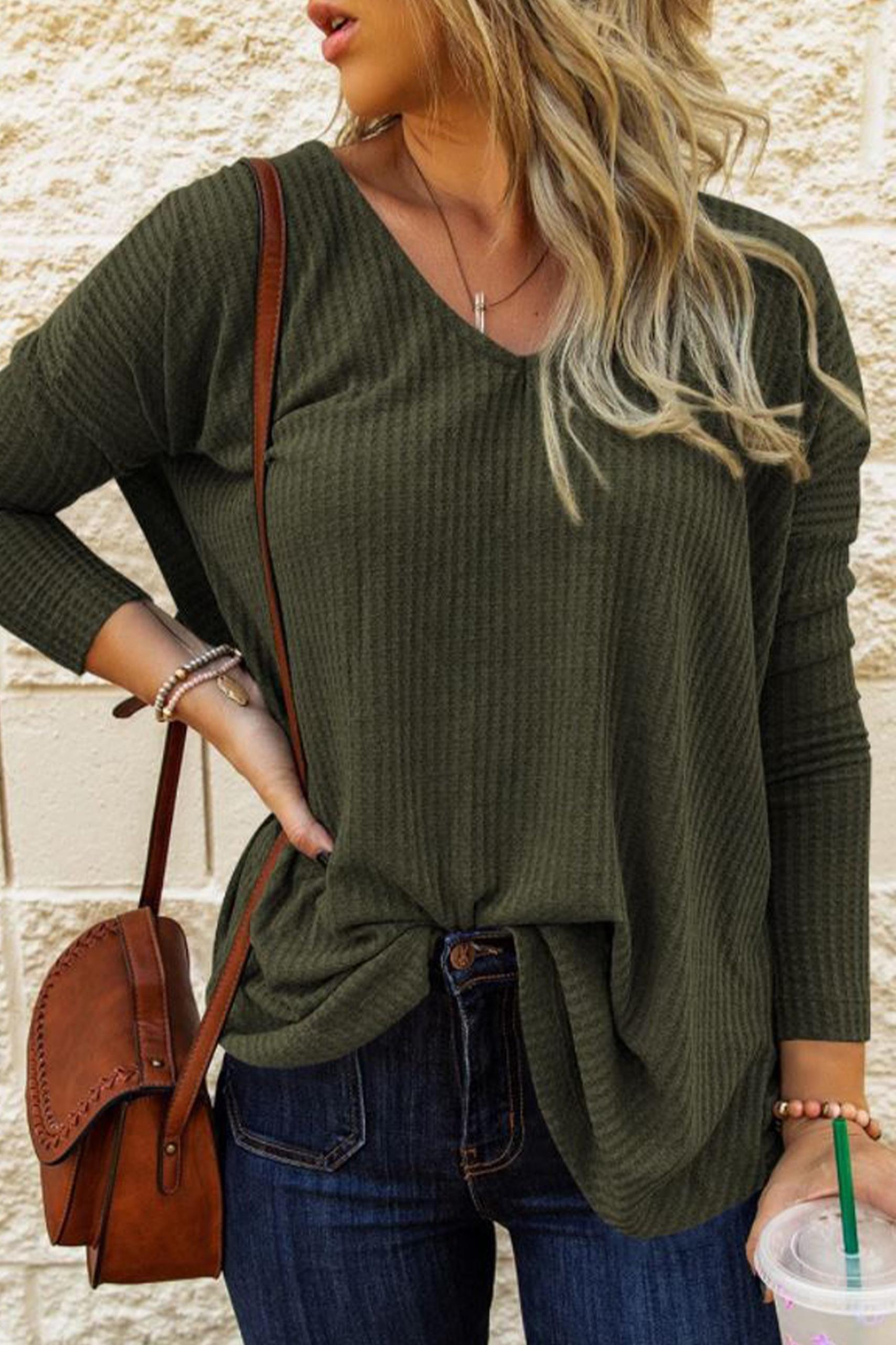 V back knot μπλούζα με ανοιχτή πλάτη και λεπτομέρεια κόμπο σε γήινες αποχρώσεις.